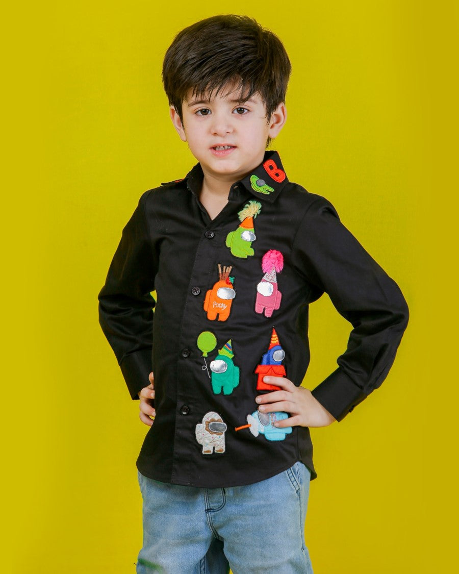 This fun black cotton shirt is decorated with colourful, handmade patches inspired by the popular "Among Us" game.Each patch is carefully hand-made, bringing playful space characters to life with vibrant detail.Perfect for little gamers who love to stand out in style and comfort!
