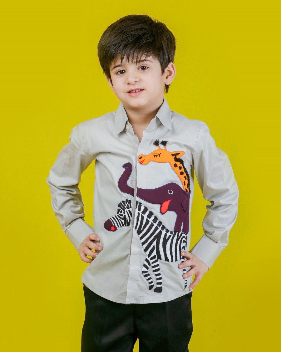 This adorable grey cotton shirt features vibrant, handmade embellished patches of a giraffe, elephant, and zebra — crafted with intricate detailing for a playful yet premium look. Perfect for kids, it's soft, stylish, and full of character, making it a fun wardrobe essential.