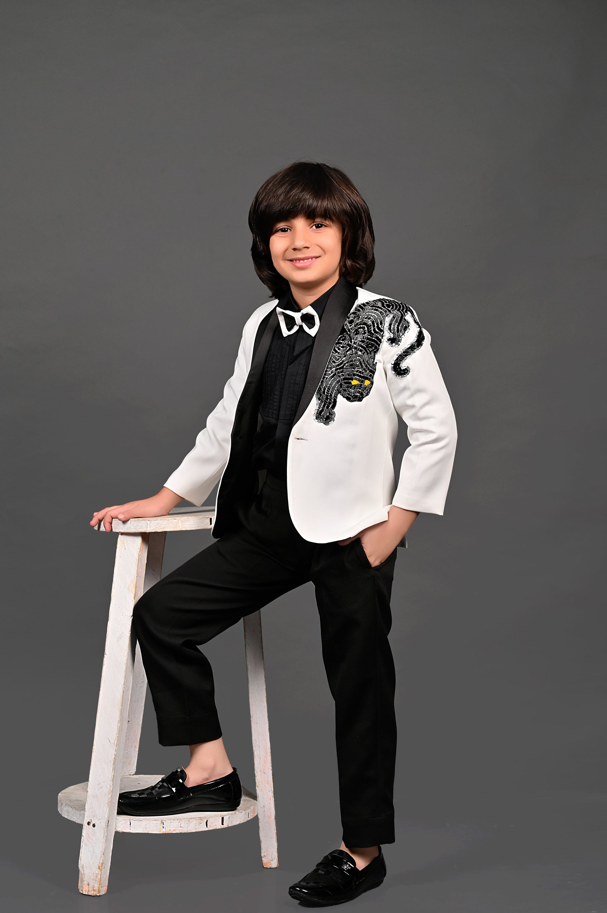 A sophisticated three-piece blazer set featuring a crisp white blazer with a striking ‘Bagheera’ motif hand-embroidered on the left shoulder. Paired with a black shirt, formal black pants, and a bow, with delicate handwork detailing on the bow as well. Every element is meticulously handcrafted, showcasing exquisite artisanal embroidery and finishing for a bold, elegant statement.