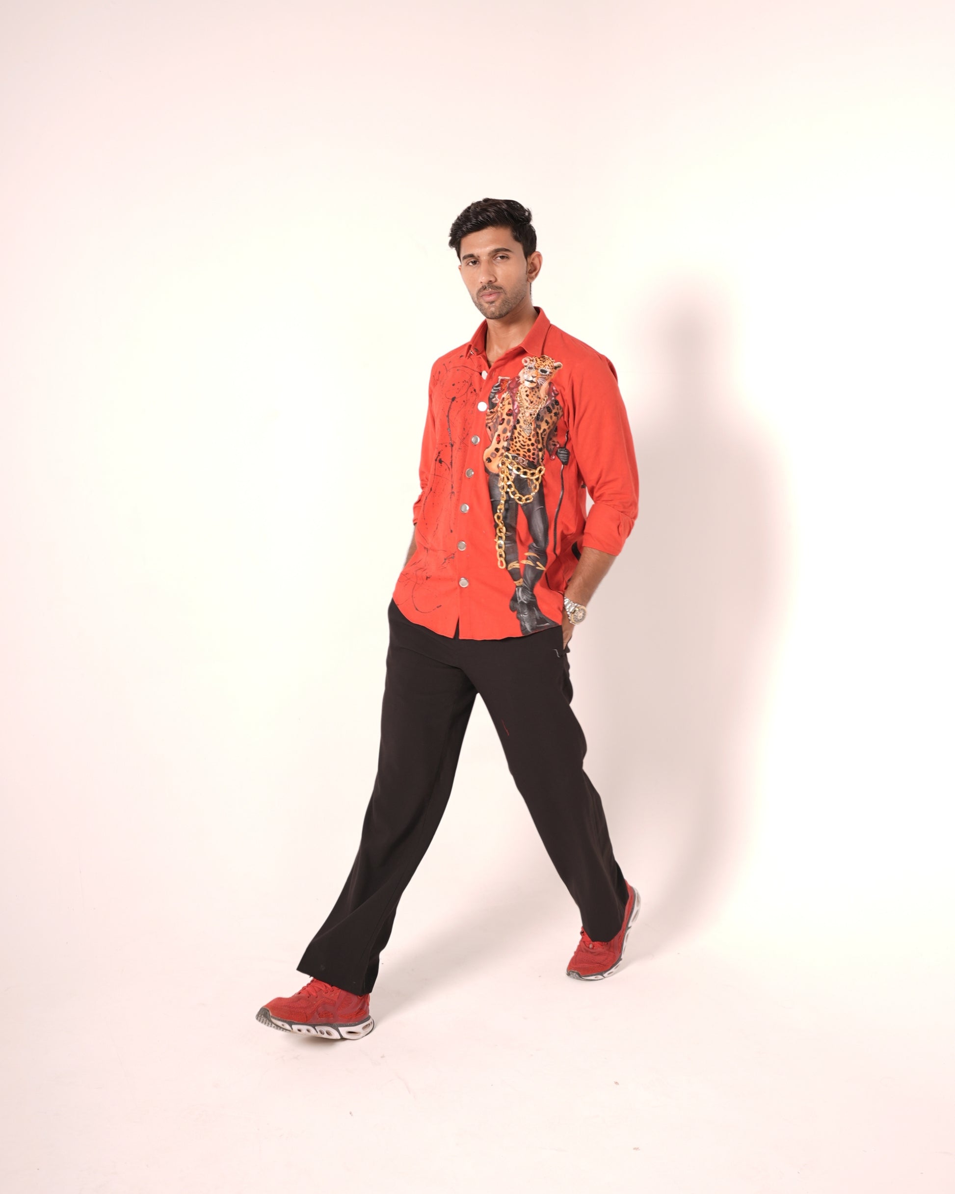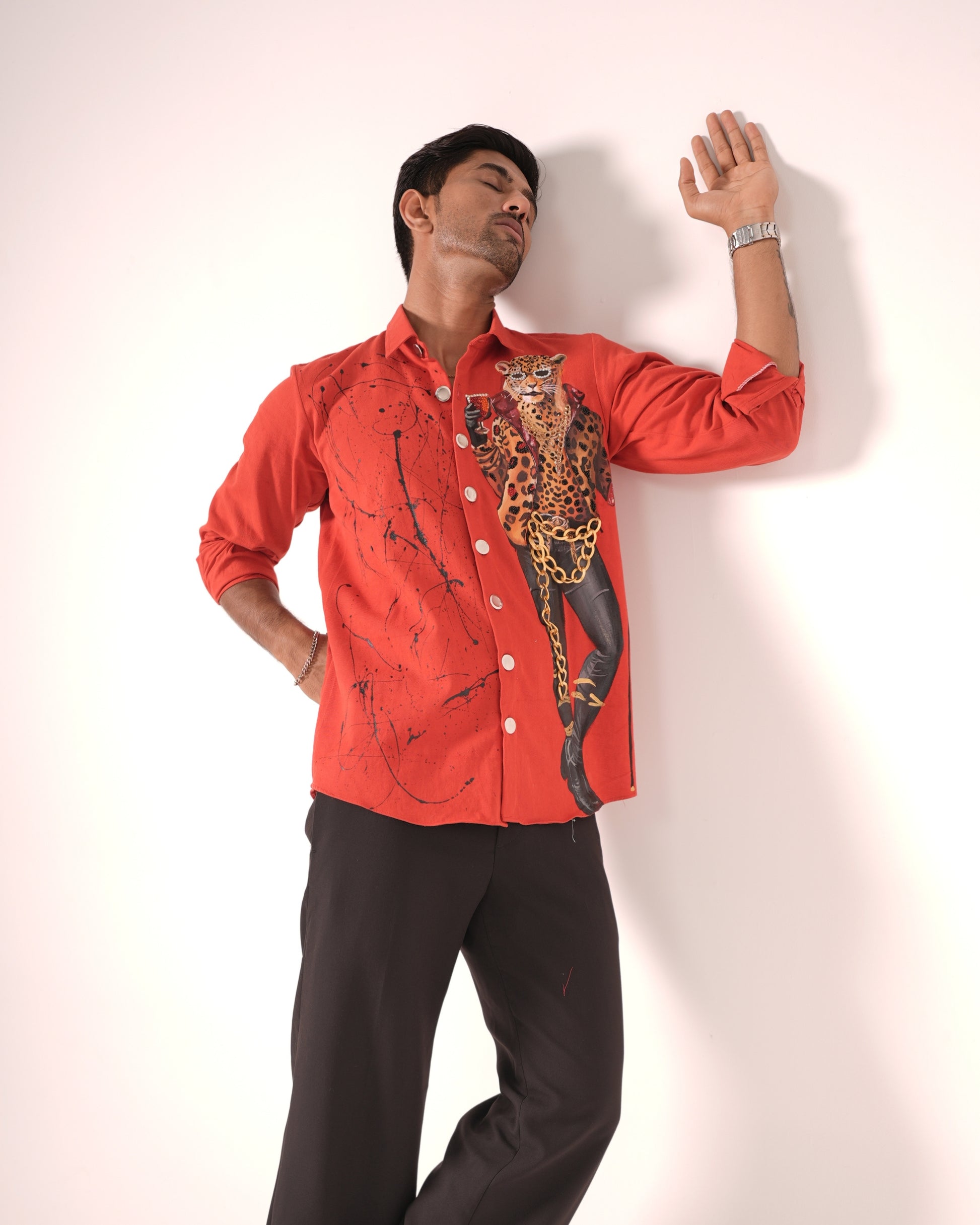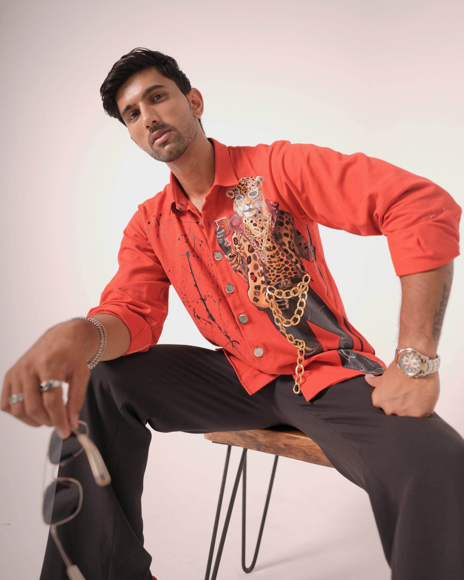 A fiery red denim shacket with fierce hand embroidery featuring a leopard and gold chains. Bold, bossed-up, and built for those who lead the pack. The back is fully embellished with hand painting and sprinkles of handwork, adding that extra edge.
