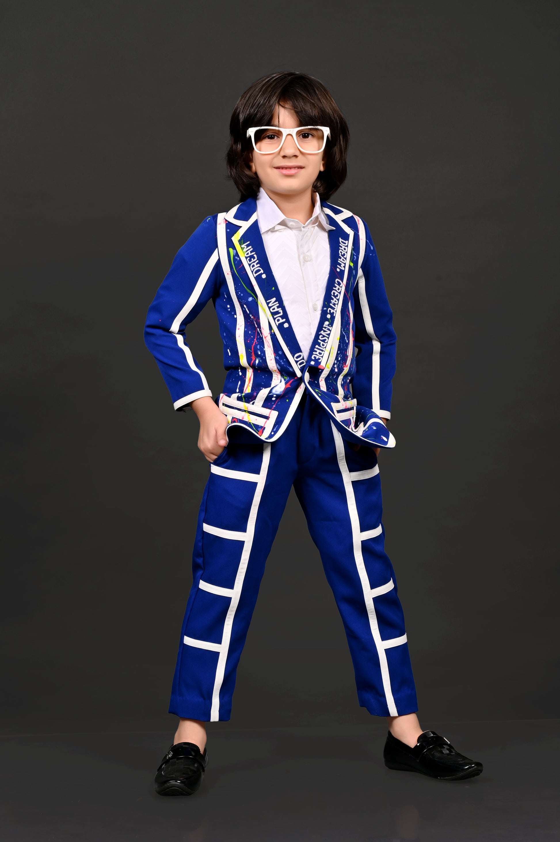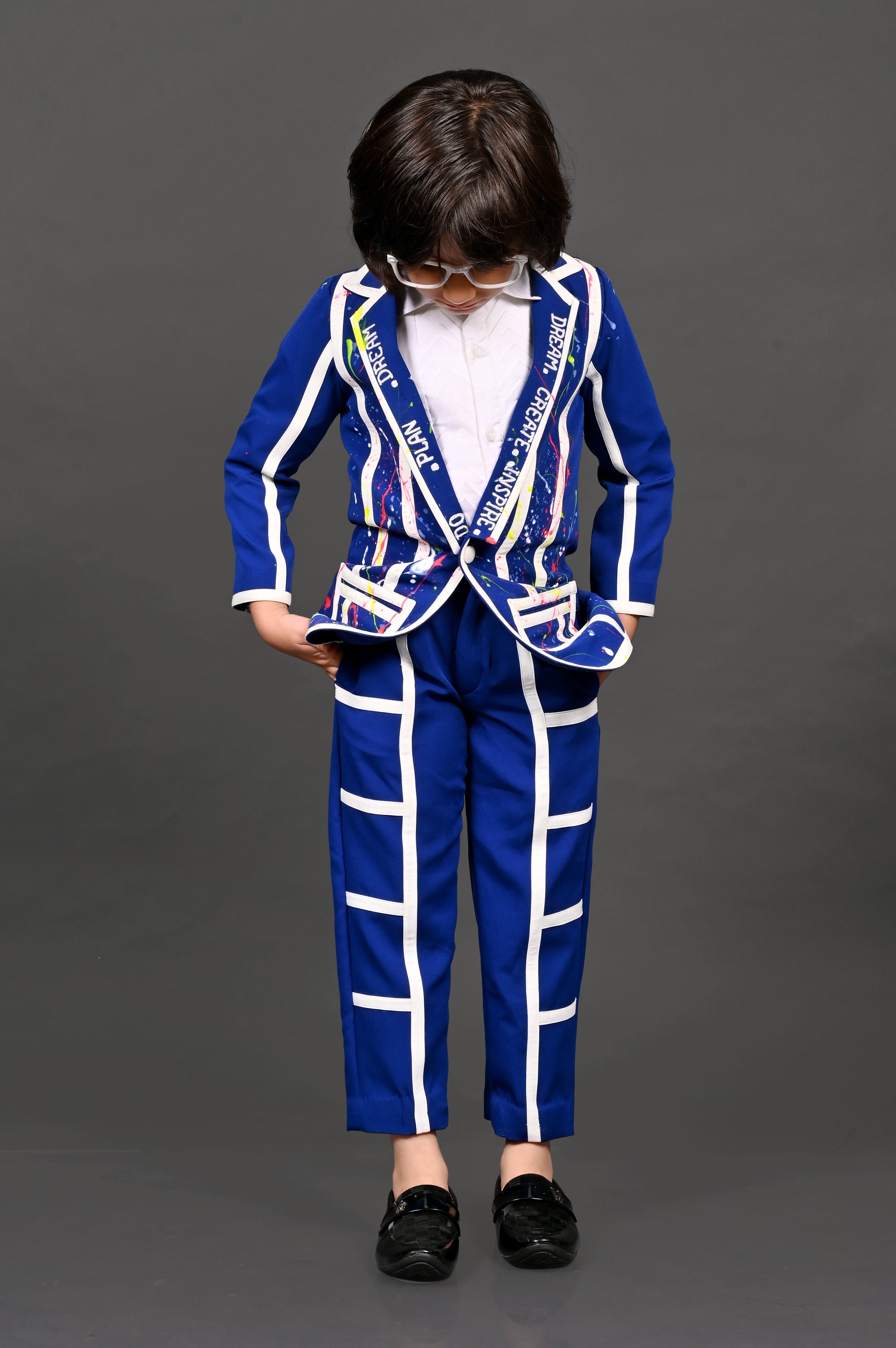 A sharp formal blue blazer paired with a crisp cotton white shirt and matching pants featuring subtle white stripes for boys. The ensemble is elevated with intricate hand embroidery showcasing carefully stitched words, complemented by delicate hand-painted details on the fabric. Every element reflects meticulous craftsmanship, making it a standout outfit for style and sophistication.