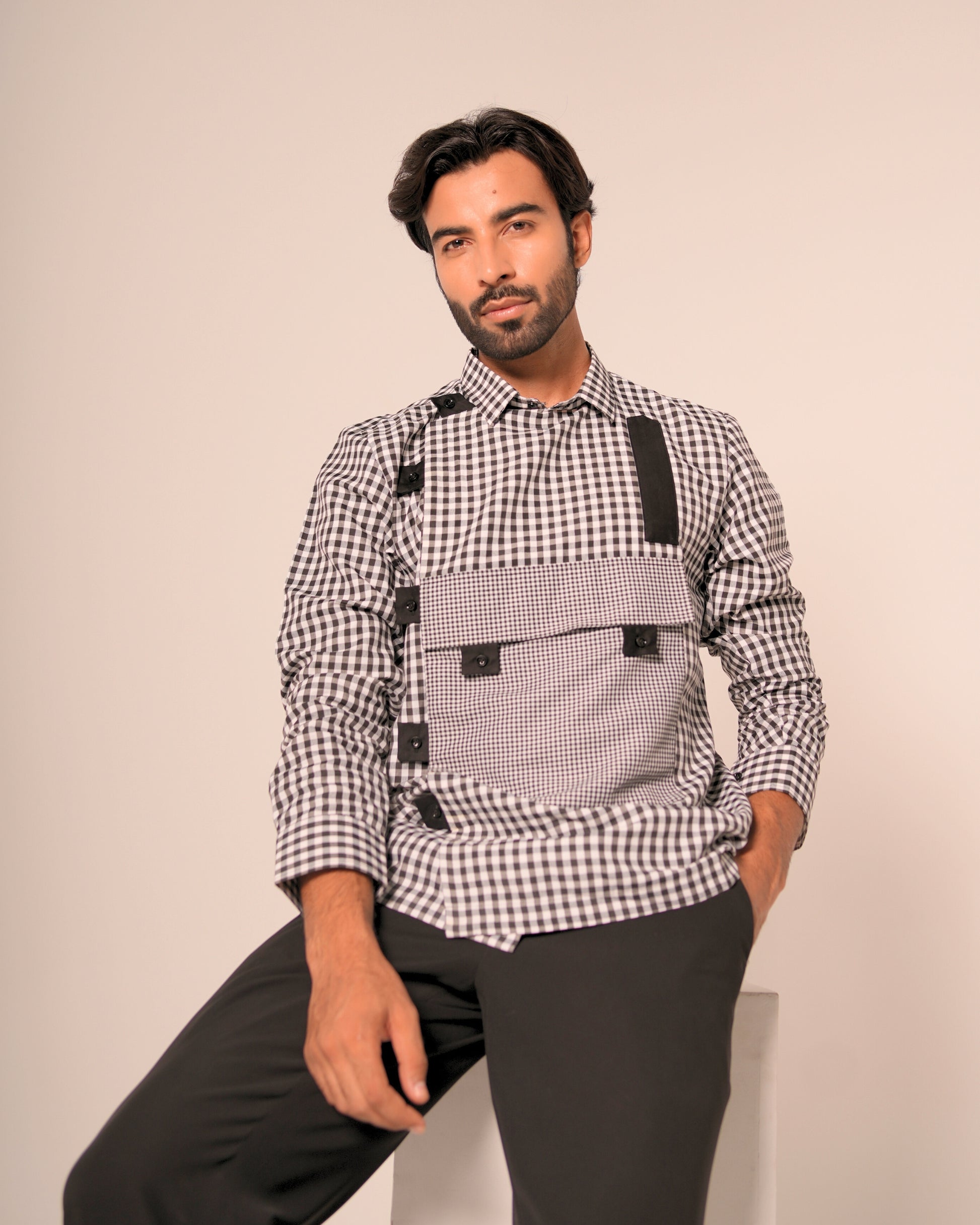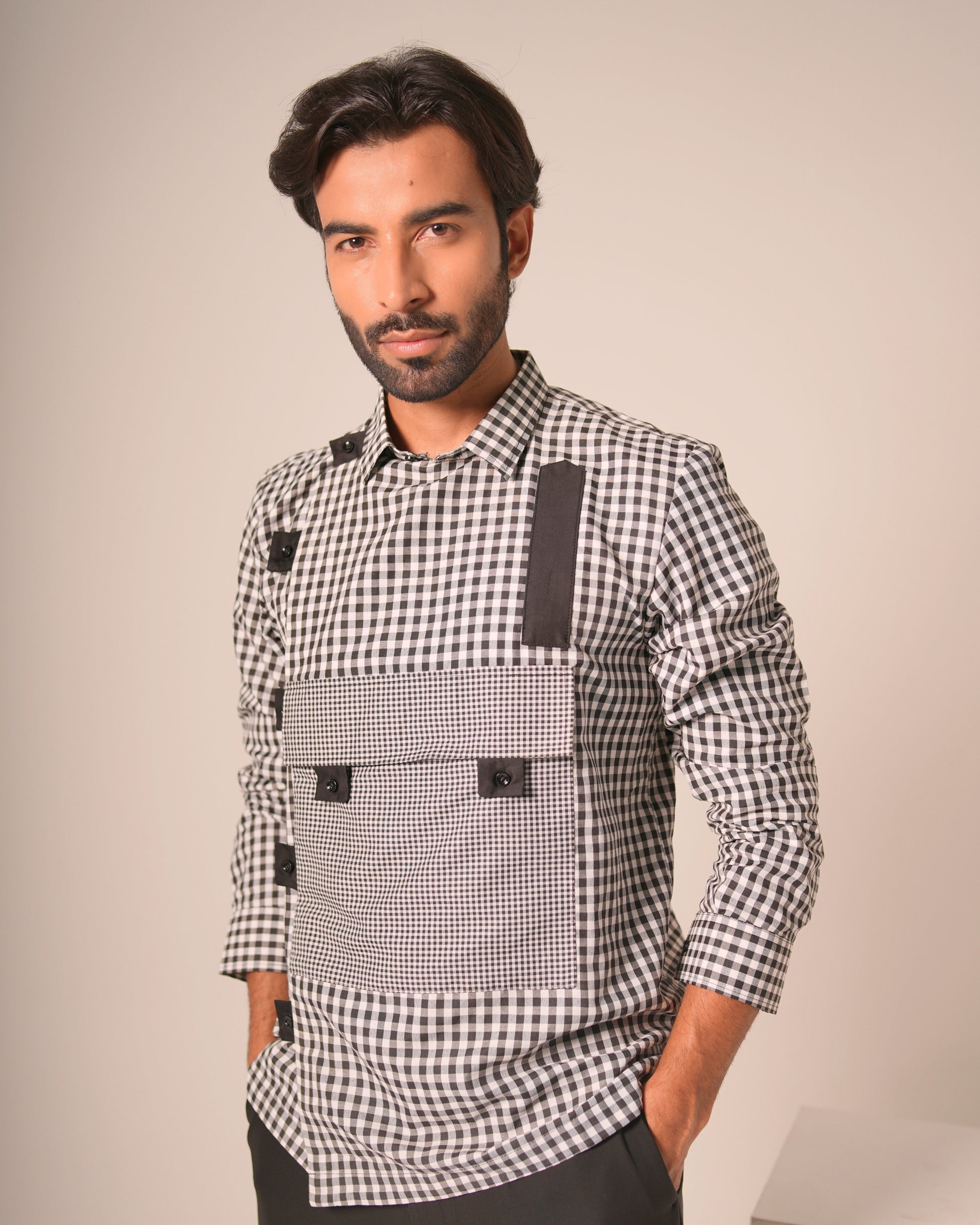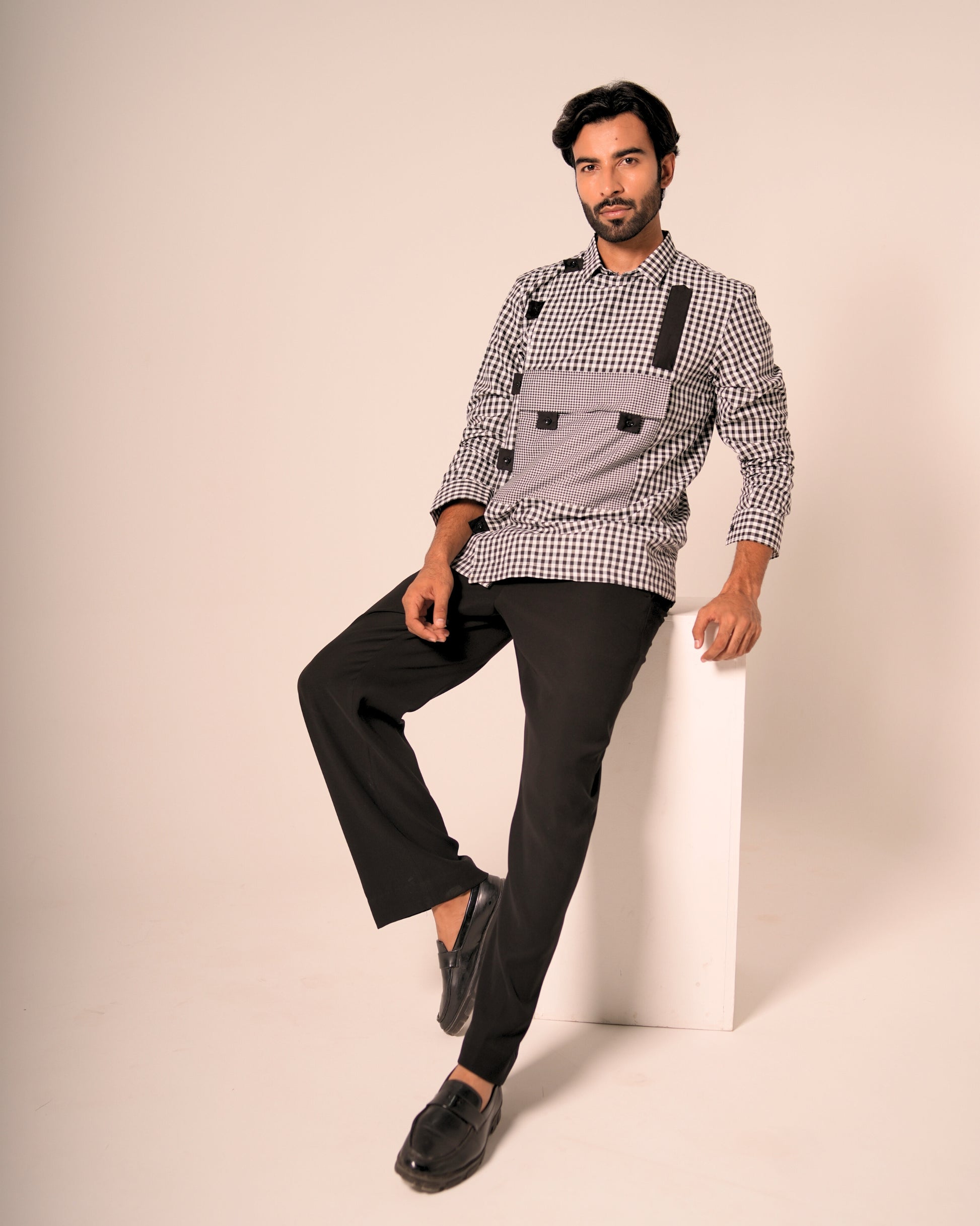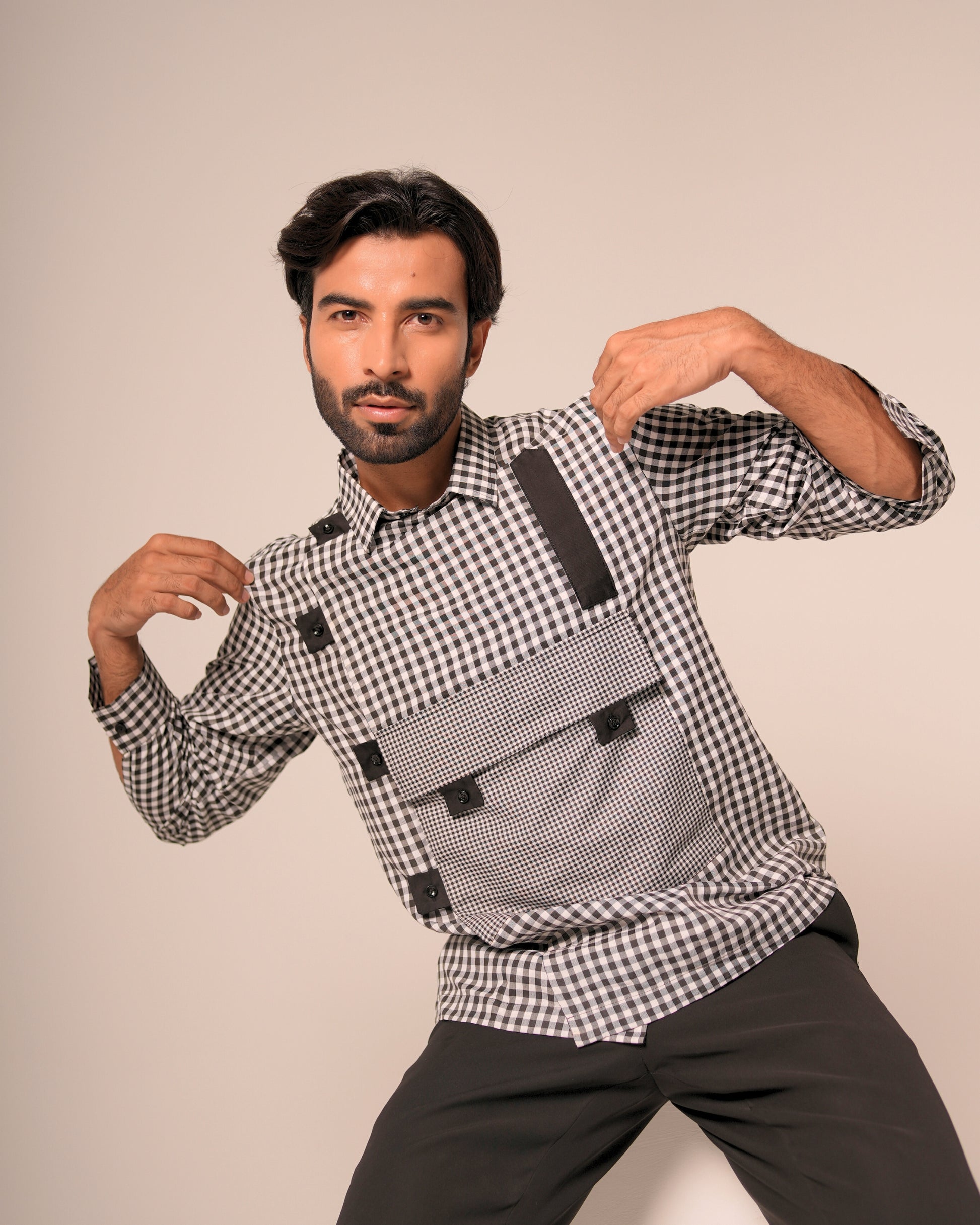 This shirt is a black checkered piece designed with a bold, modern twist. Its standout feature is the oversized check pocket placed right at the center, making it the focal point of the look. This shirt blends everyday comfort with a touch of streetwear edge.