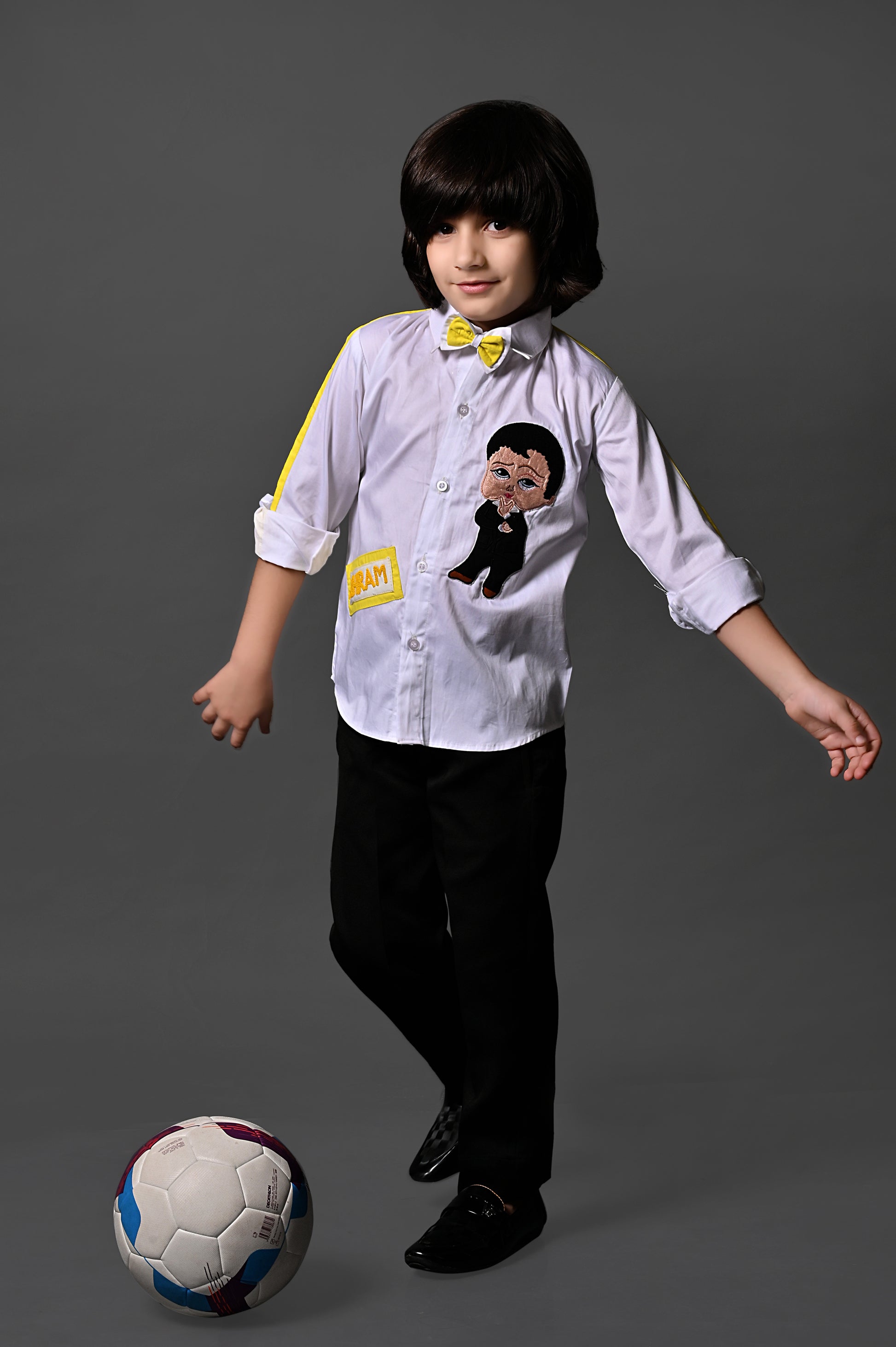 This white cotton full-sleeve shirt is personalised with a custom name alongside the Boss Baby logo, crafted in fine handwork embroidery and having back embroidery detail . Designed in a classic shirt style, it is enhanced with striped detailing on the sleeves for a modern touch and having a detailed bow. A unique handcrafted piece that blends comfort, creativity, and individuality.
