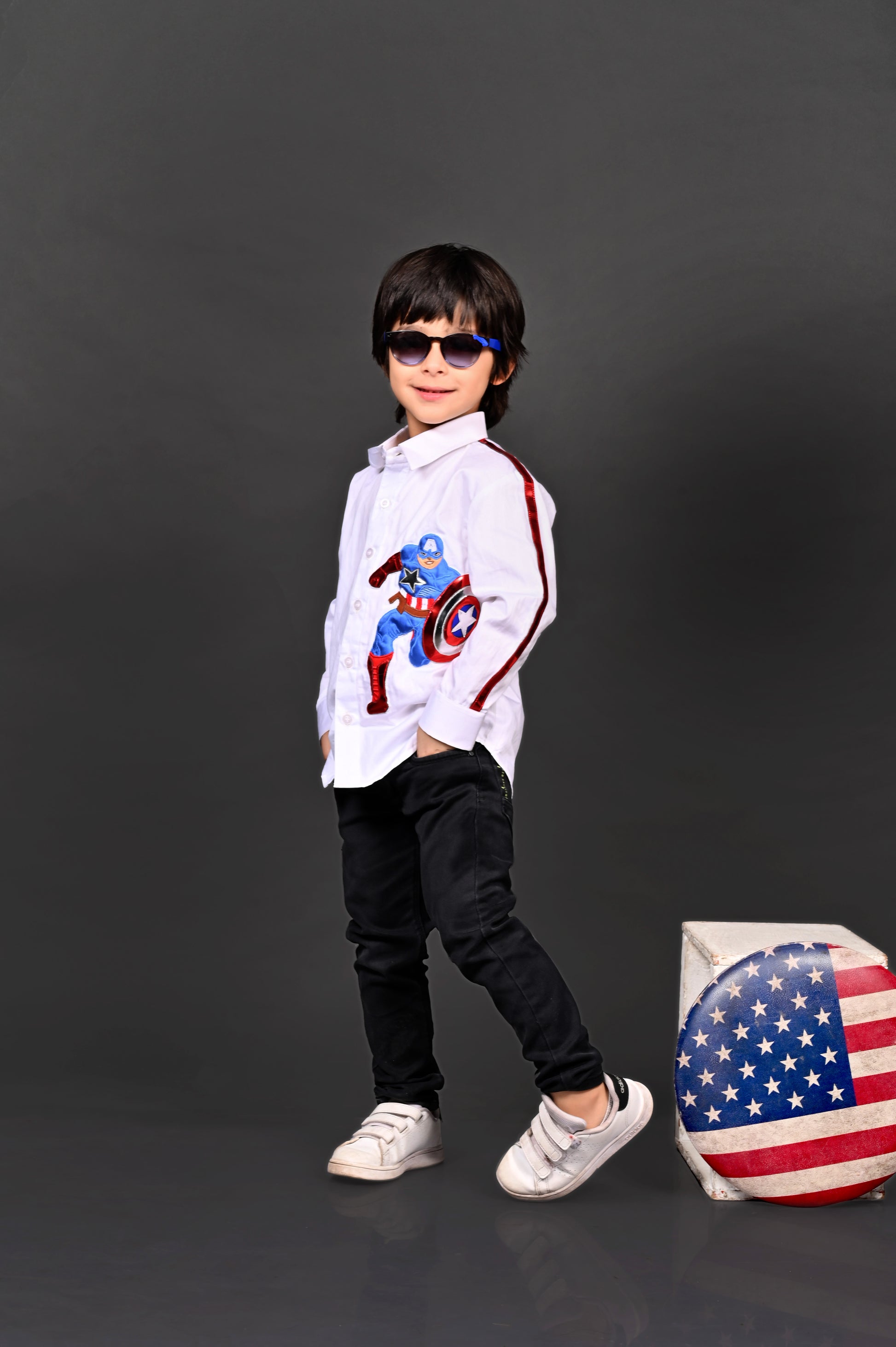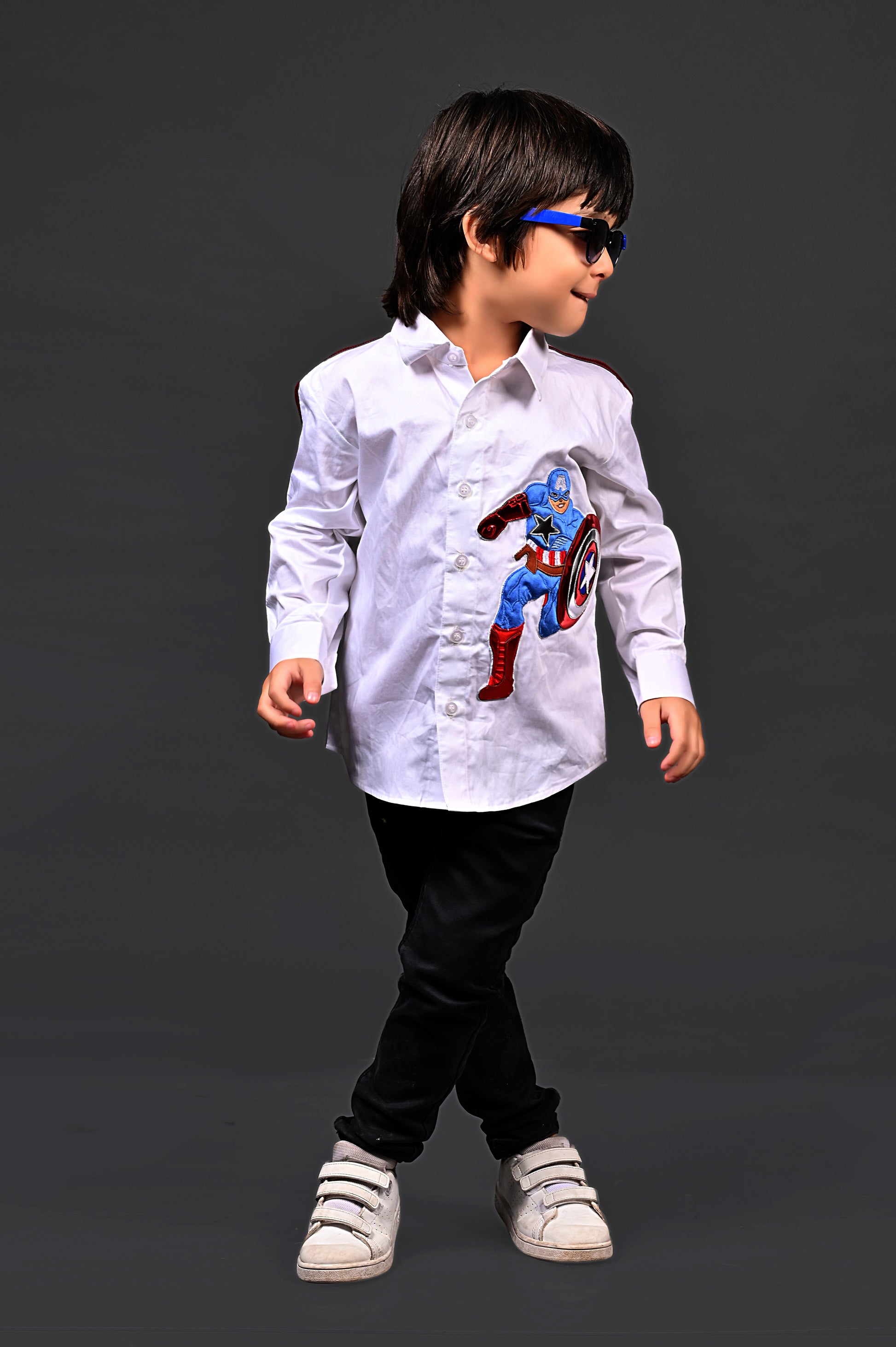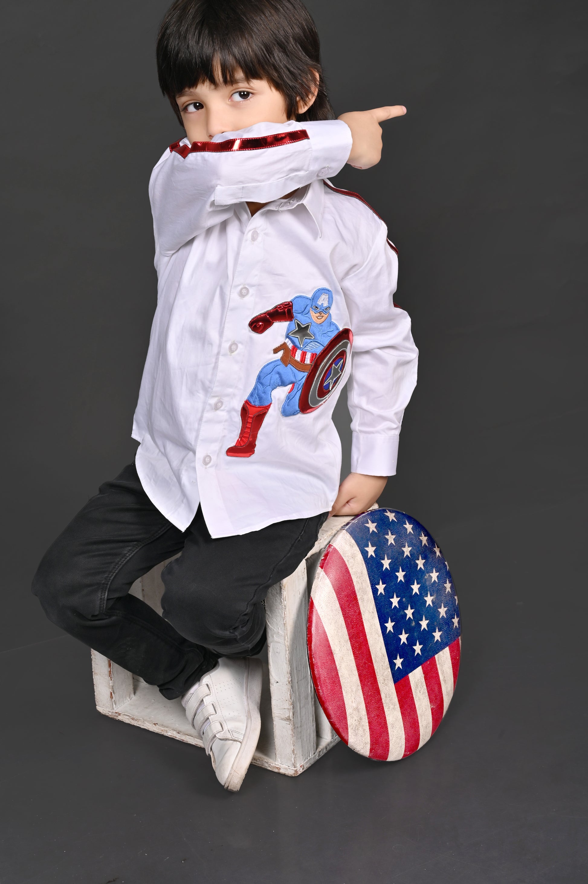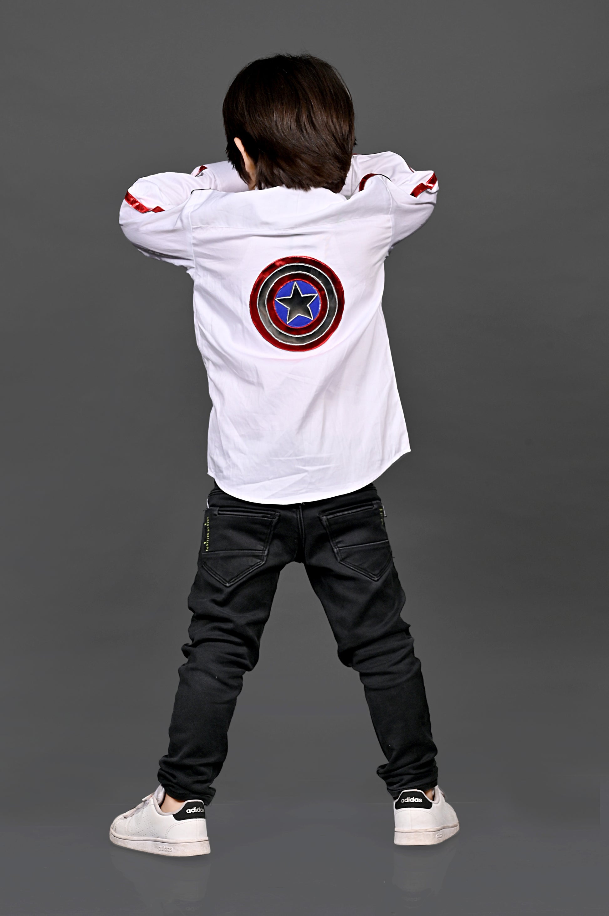 This white cotton full-sleeve shirt with stripes on sleeve stands out with a bold Captain America handwork patch detailing in front and intricate hand embroidery on the back. Styled in a classic shirt silhouette, it blends casual elegance with superhero-inspired craftsmanship. A unique handmade piece that combines comfort, style, and creativity.