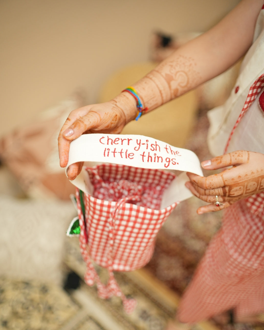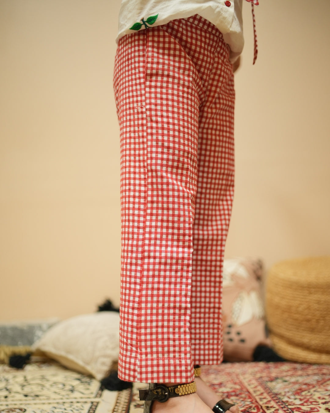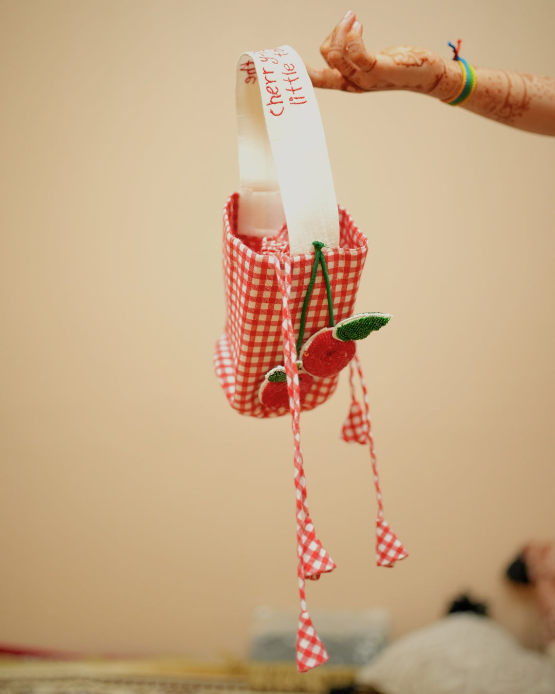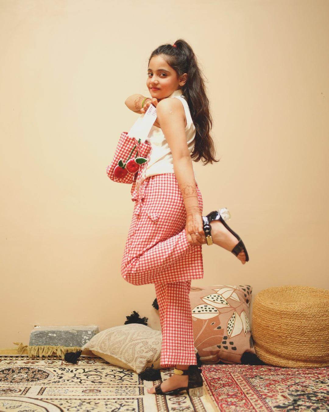 A playful white and red cotton shirt adorned with hand-embroidered cherry motifs crafted in sparkling cut-dana work. Paired with cotton check pants and a matching cherry-themed potli bag, also intricately embellished with handmade cut-dana detailing. Every element showcases exquisite artisanal craftsmanship.