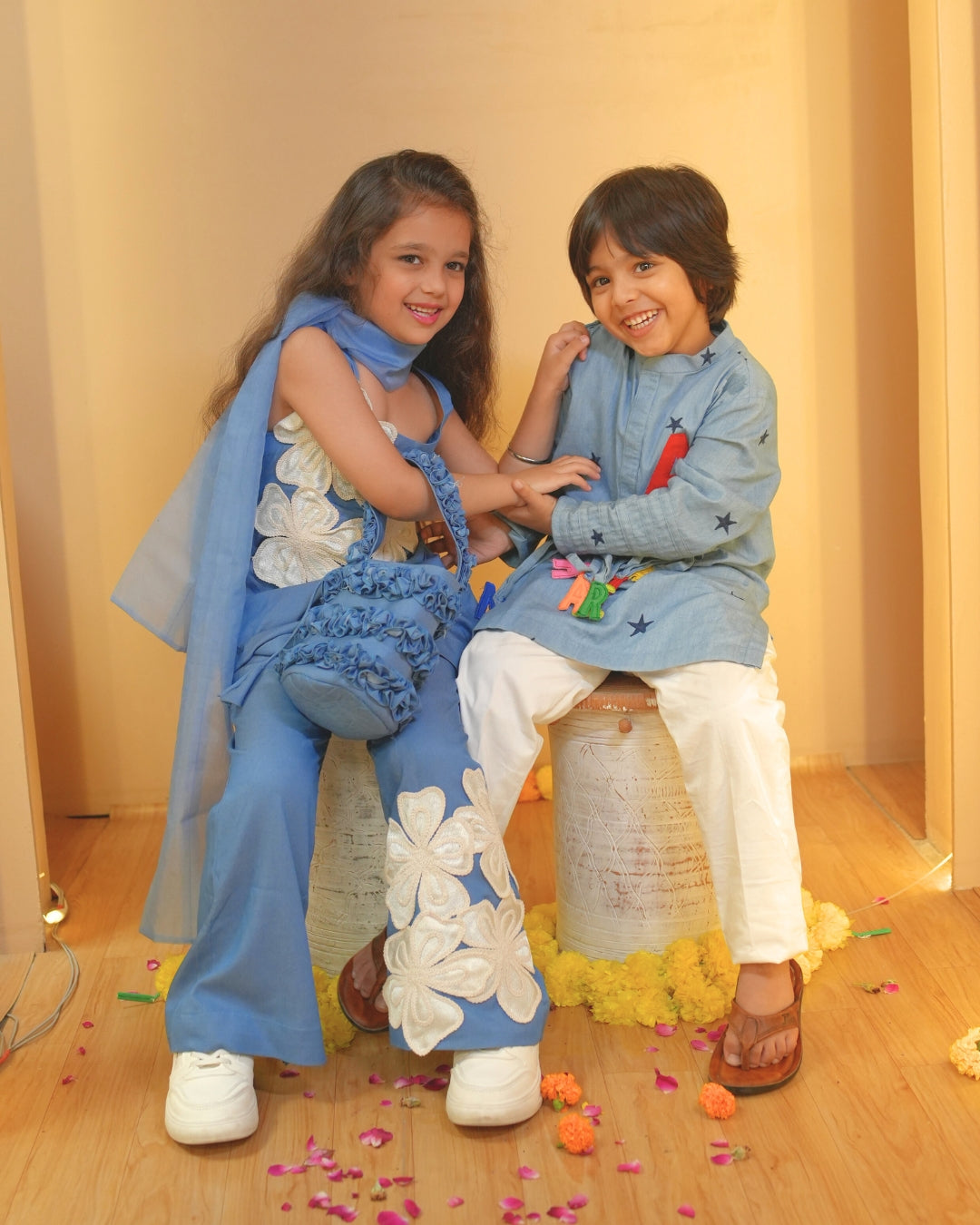 This stylish denim-blue co-ord set for girls, featuring delicate white handmade floral appliqués on the top and flared pants. Paired with a matching ruffle potli and coordinating scarf, both crafted by hand for a perfect finish. A chic ensemble that blends comfort, elegance, and artisanal craftsmanship