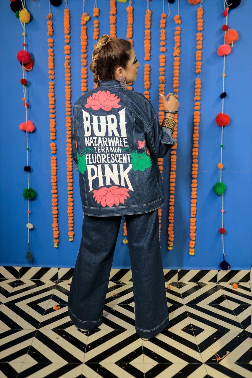 Step into bold artistry with this denim co-ord set, featuring a striking hand-painted portrait detailed with hand embroidery and lavish embellishments of pearls and stones. The wide-leg pants carry the word “QUEEN” in shimmering accents, celebrating empowerment with style. A true fusion of contemporary denim and regal craftsmanship, this look is designed to turn every occasion into a statement.