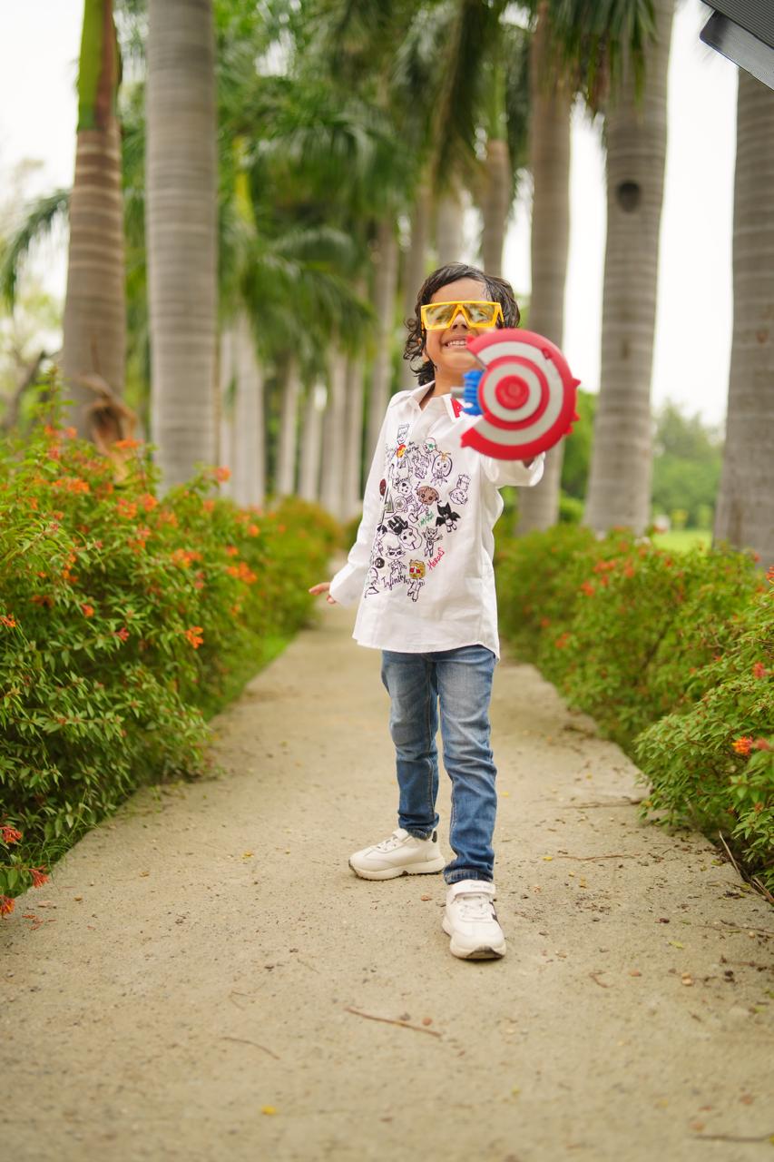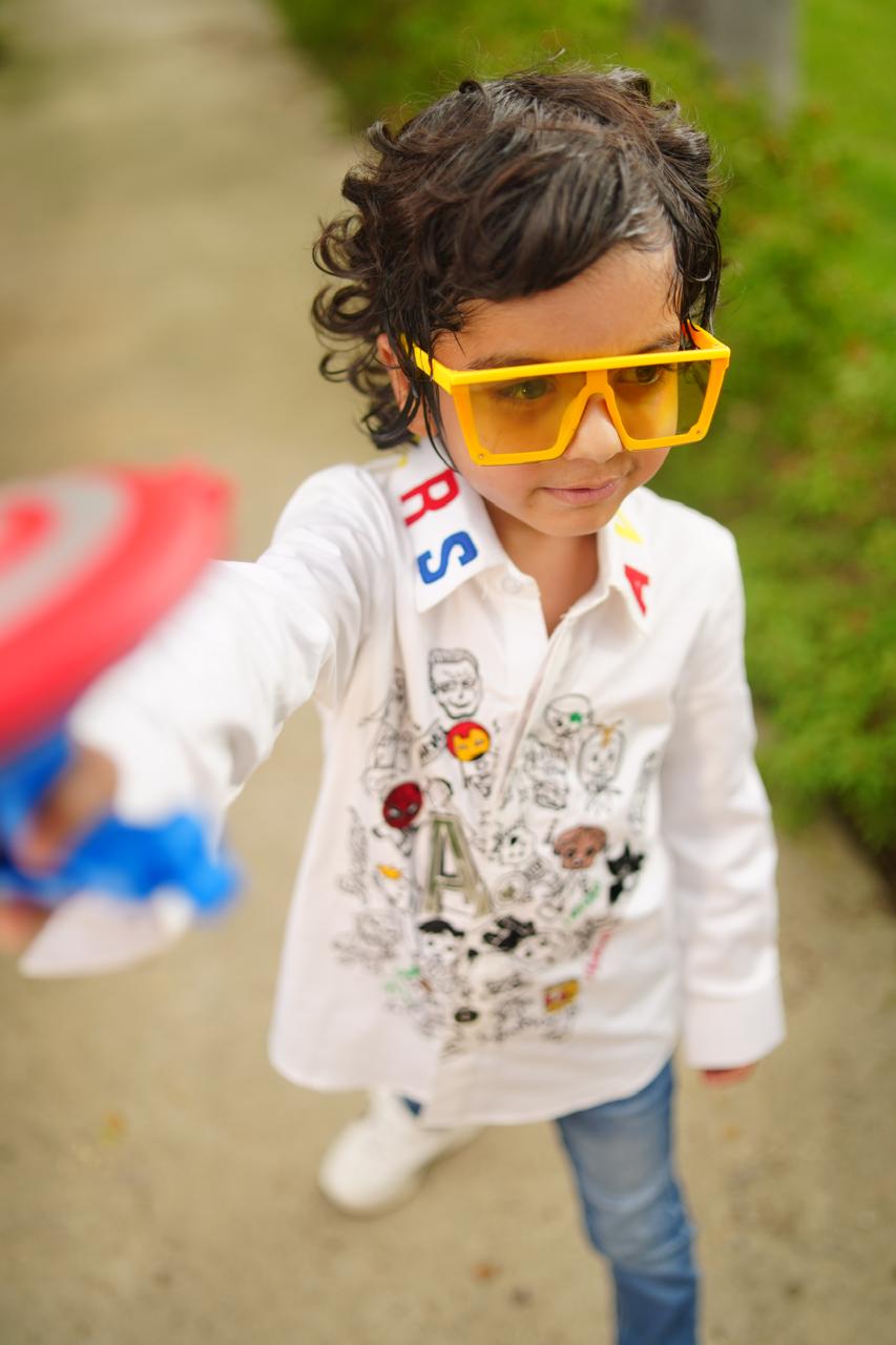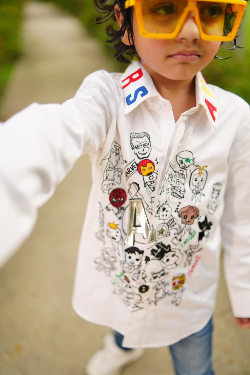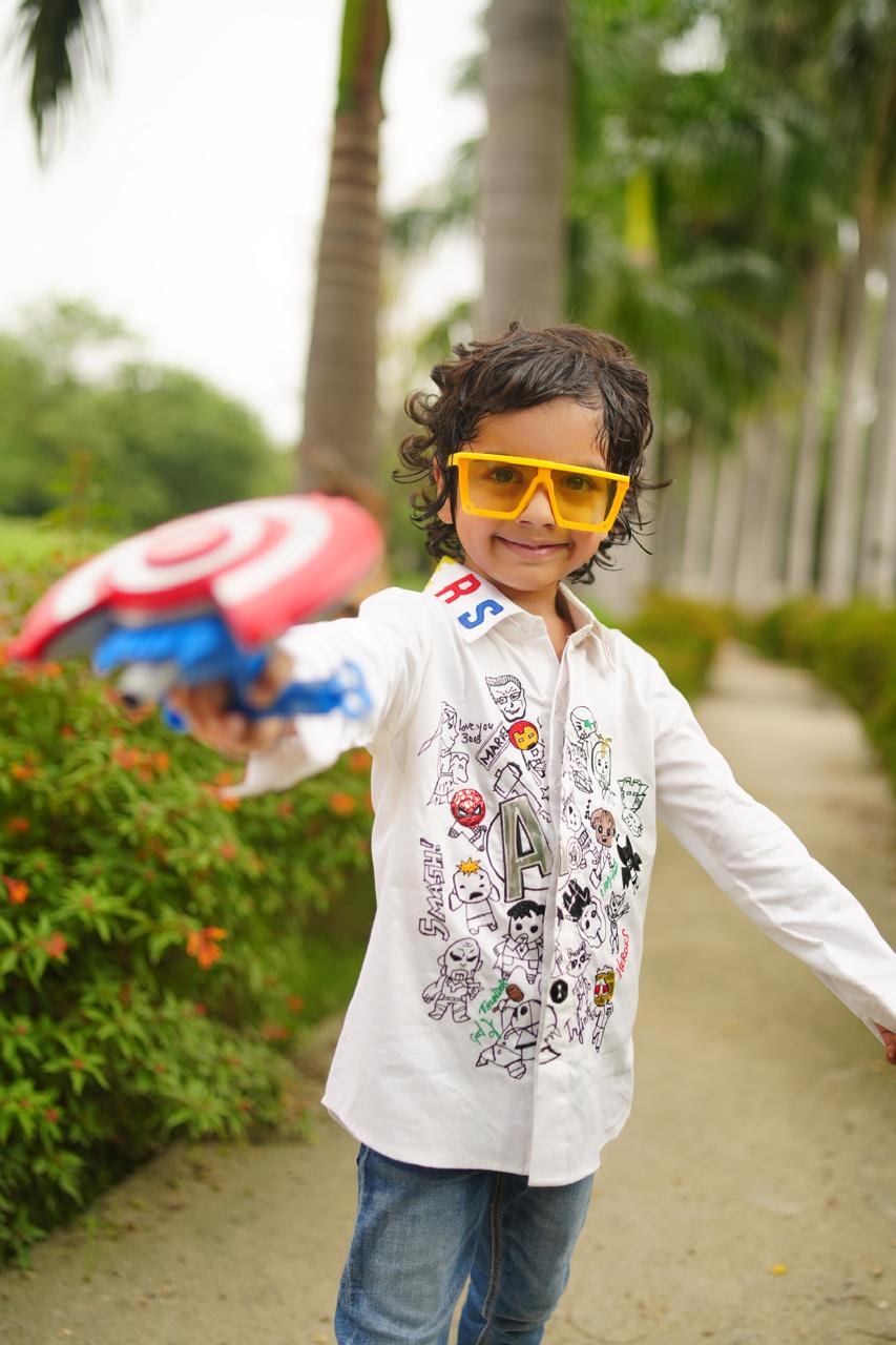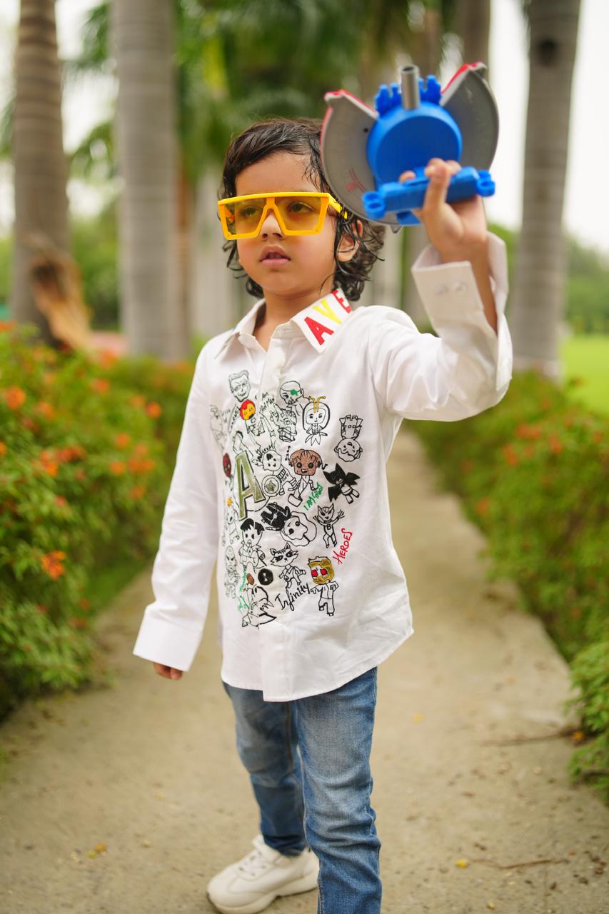 A smart white boys' cotton shirt decorated with fun doodle art illustrations with patch work embellished and neat embroidery work written "Avengers" on the collar . Stylish yet comfortable, it adds a playful twist to any outfit.