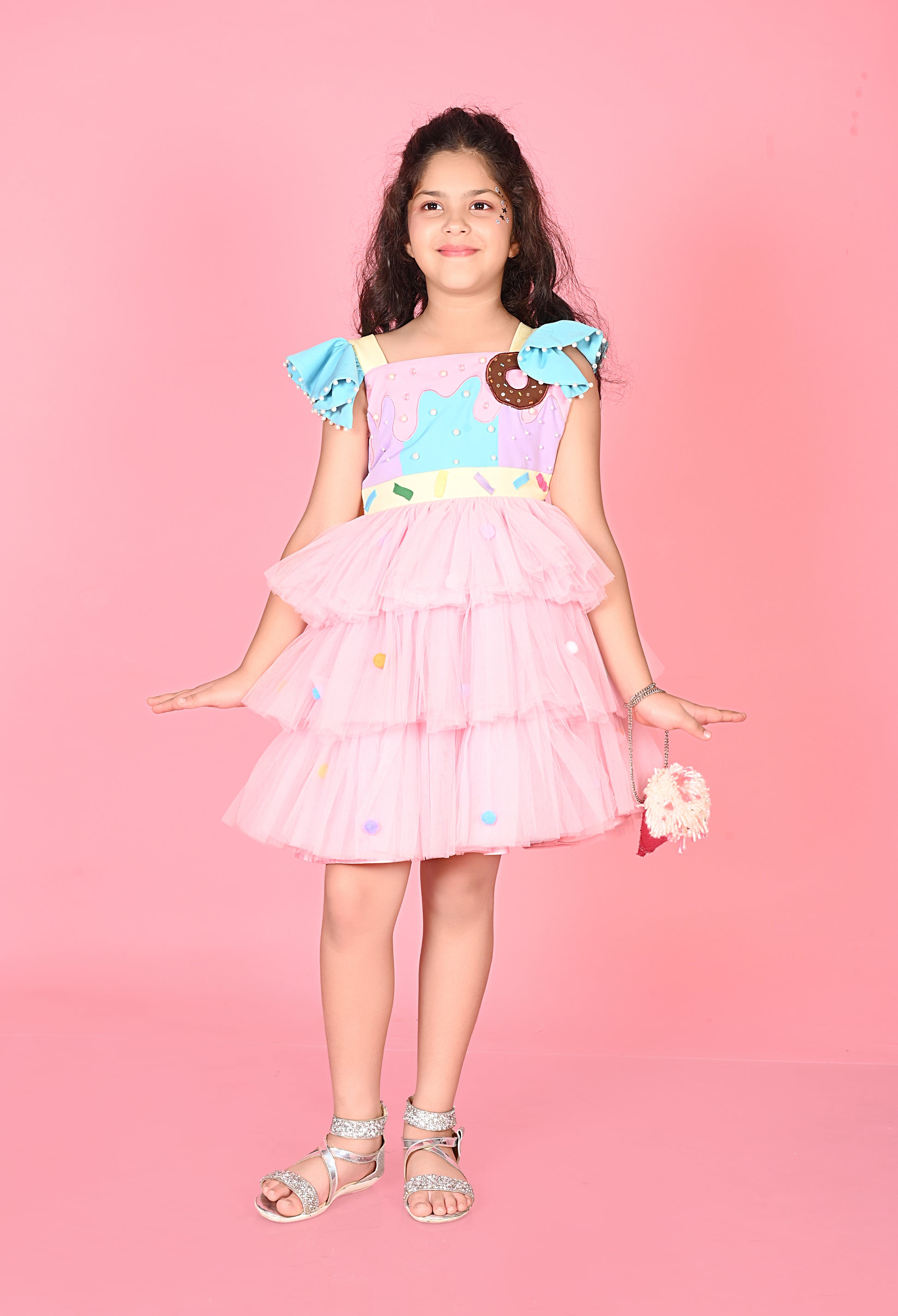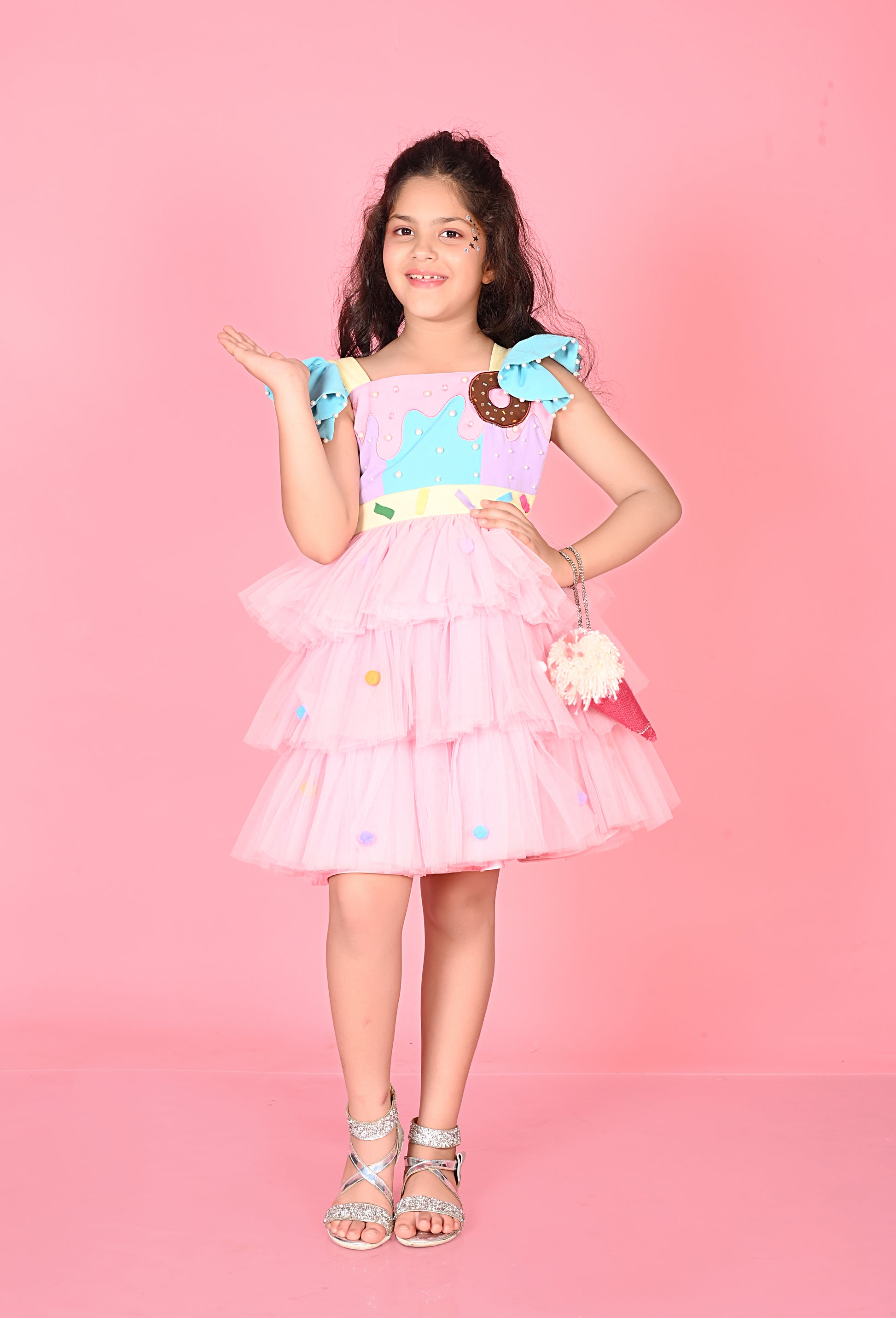 This pink dress is a delightful treat, featuring doughnut and flakes handmade patches beautifully embellished with pearls with ice cream sling bag . Ruffle detailing adds a playful and charming touch, making it a fun, handcrafted statement piece. Perfect for little ones who love whimsy and style.