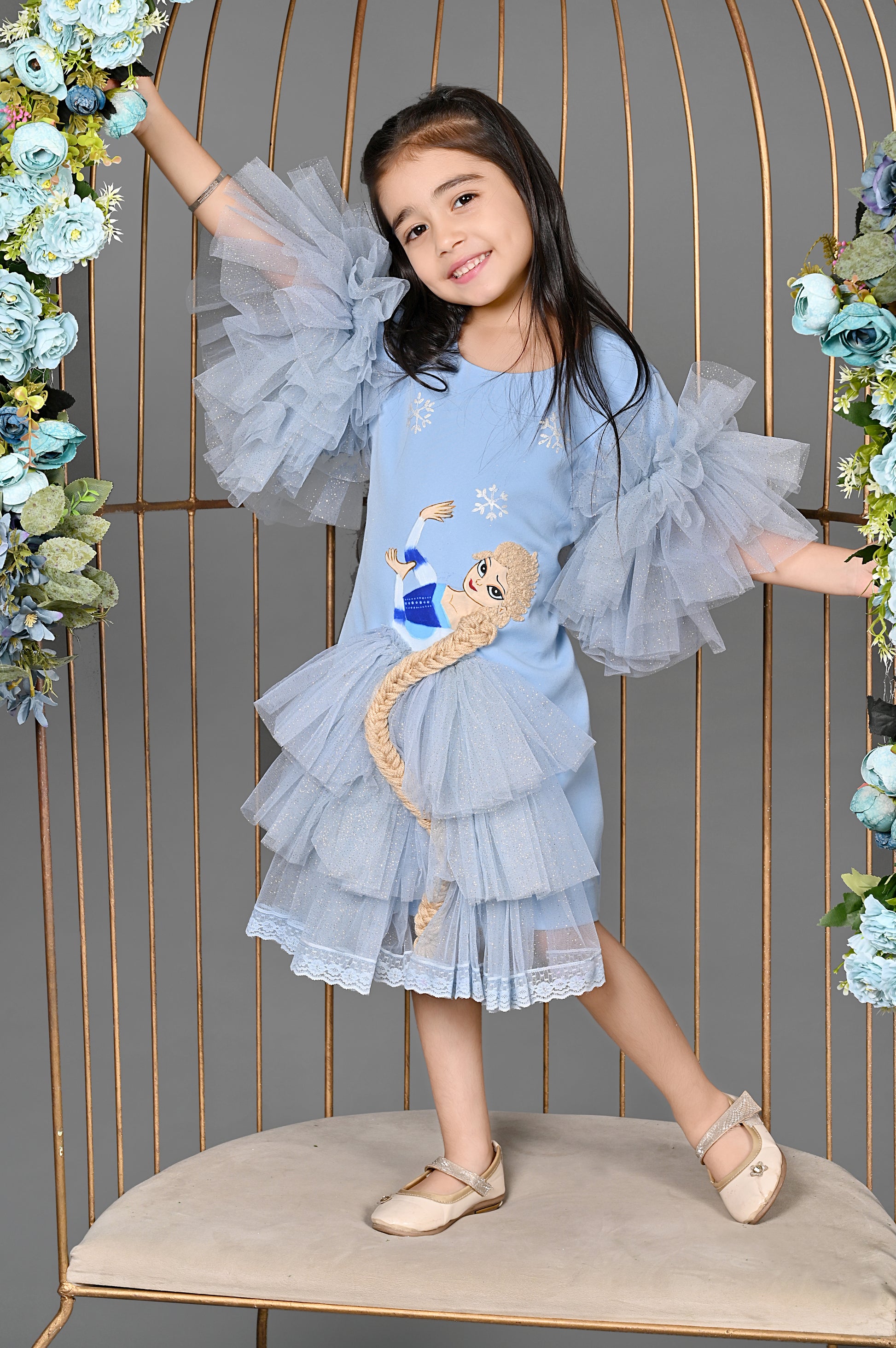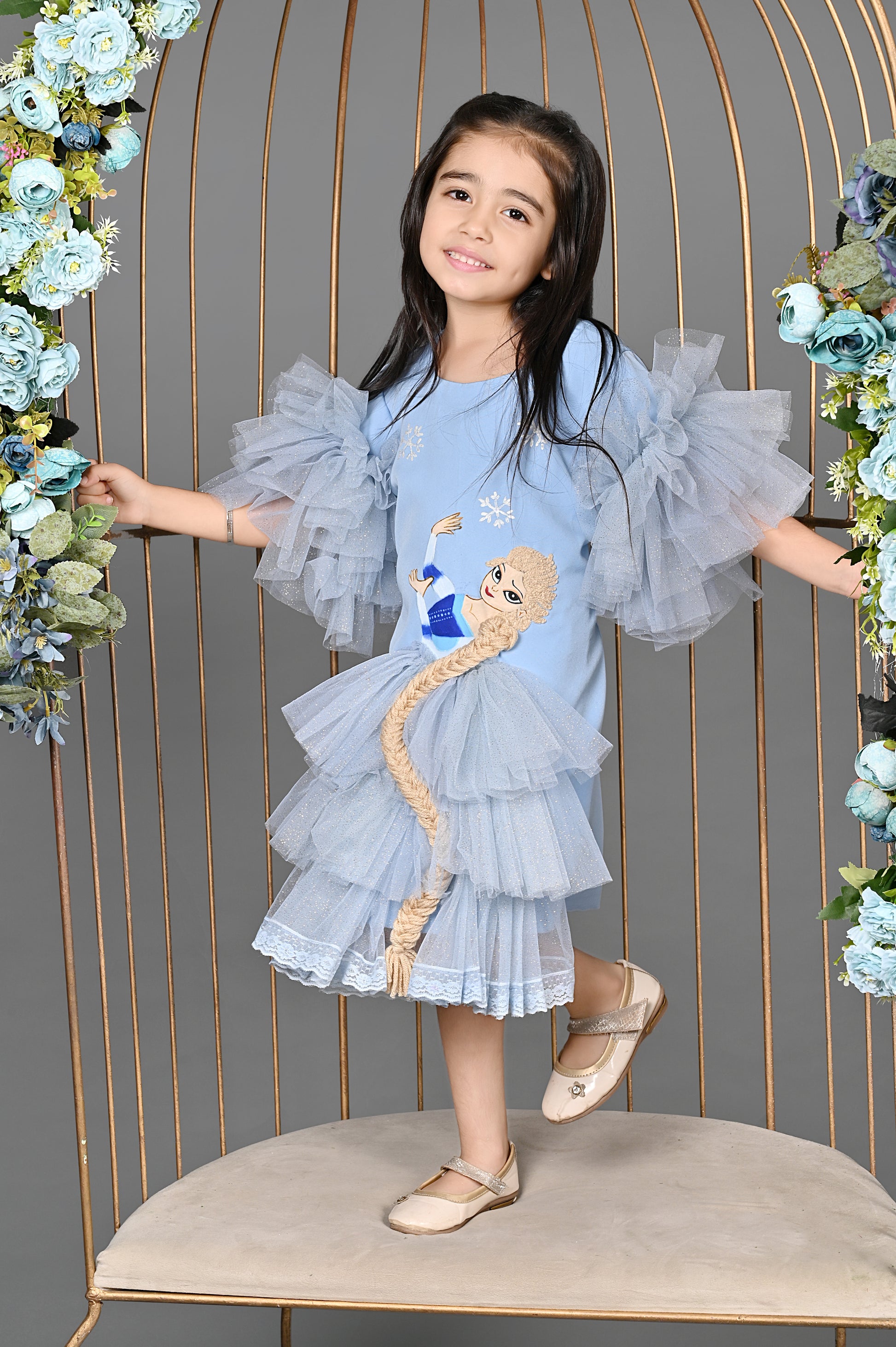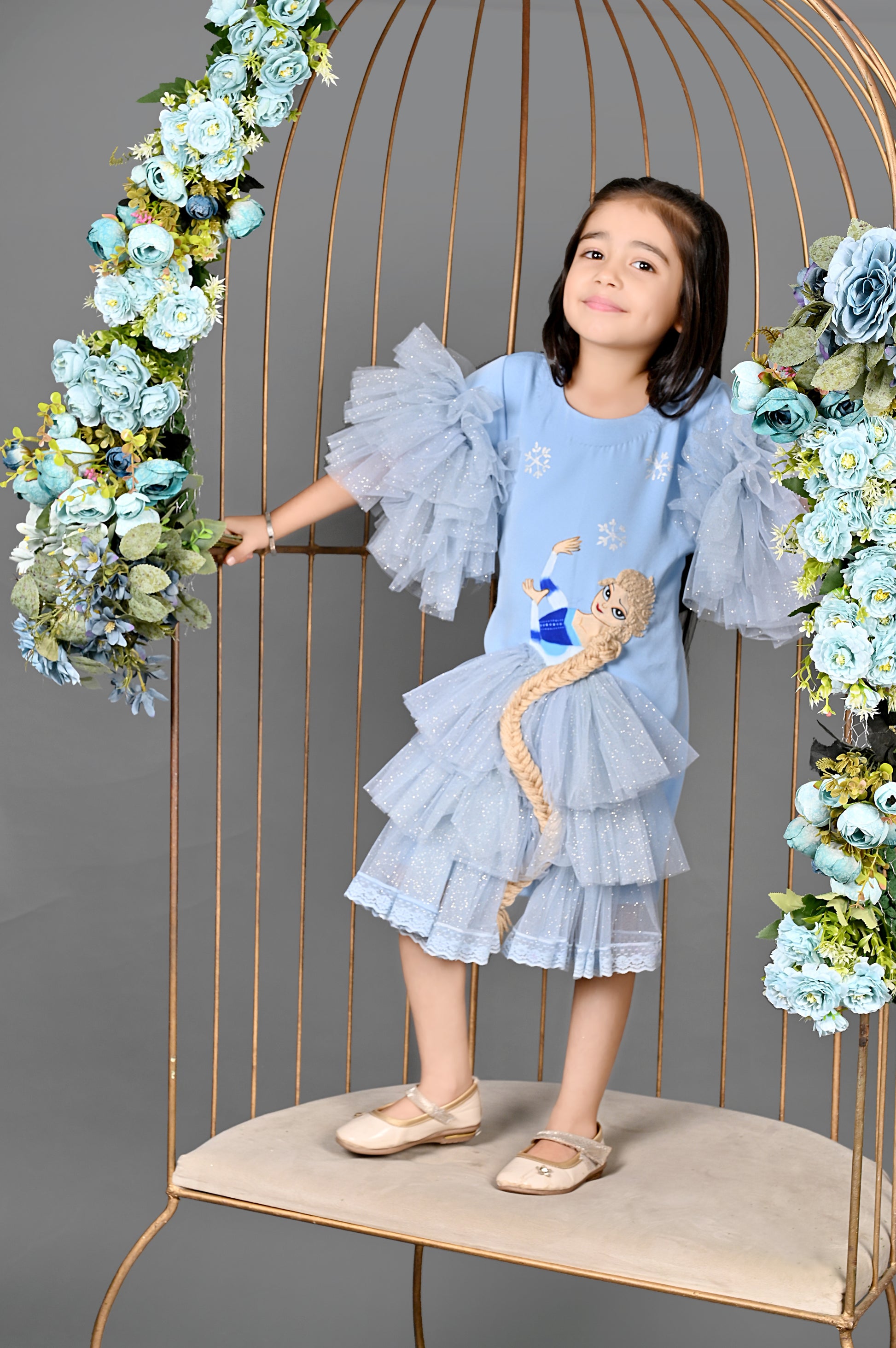 This ice blue T-shirt dress captures the magic of Frozen with its Elsa hand embroidery, crafted with fine detailing. The ruffle-detailed sleeves add a playful and dreamy touch, making it perfect for little fashionistas. A charming handmade piece that blends comfort, fantasy, and elegance.