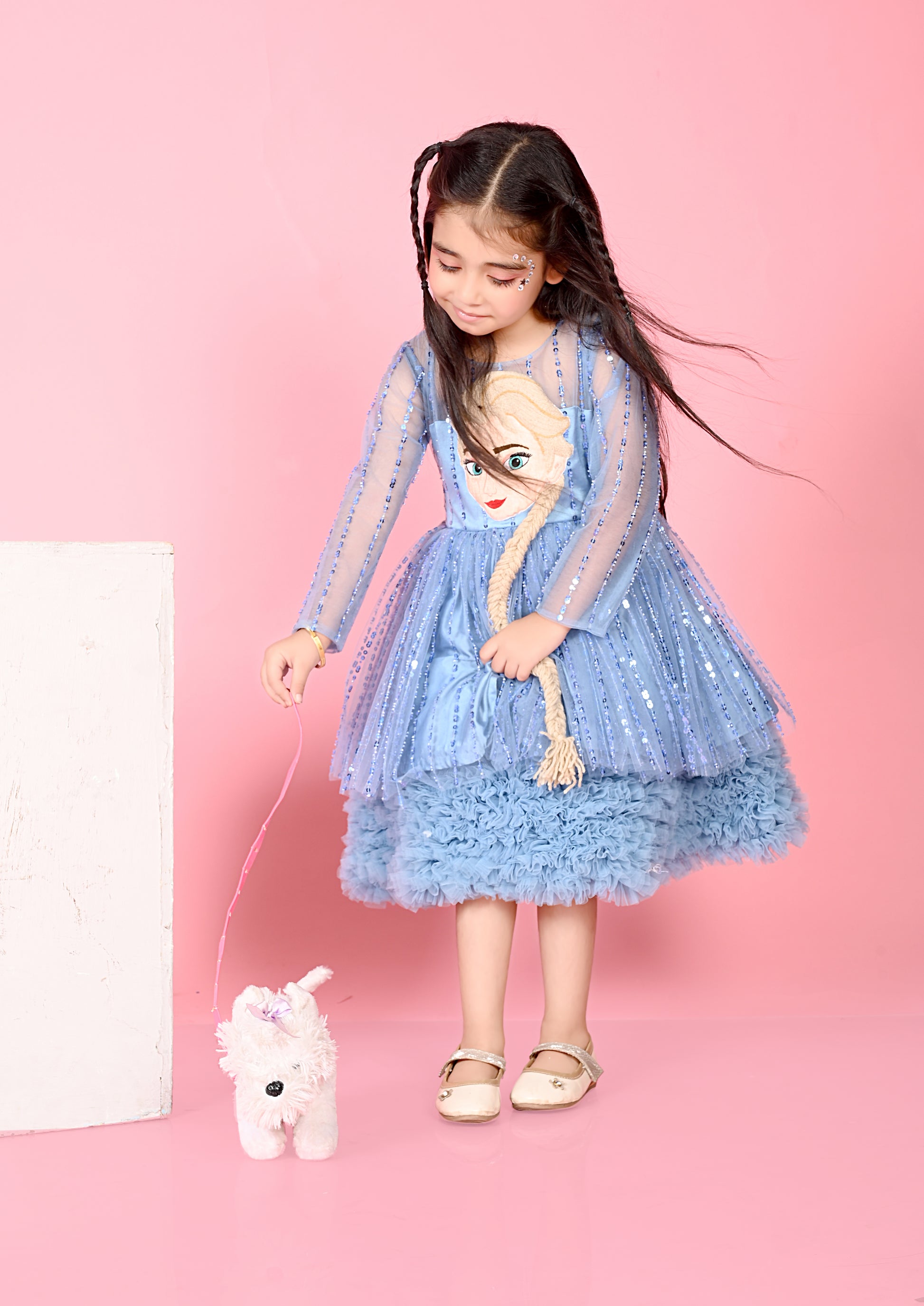 This little one’s party magical with the Frozen Blue Crafted in net and satin, it features an adorable handmade Elsa patch with braid detailing and embellished with sequence, a comfortable zipper closure, and a perfect fit for festive occasions. Ideal for special celebrations, this dress is a dreamy choice for your little princess.