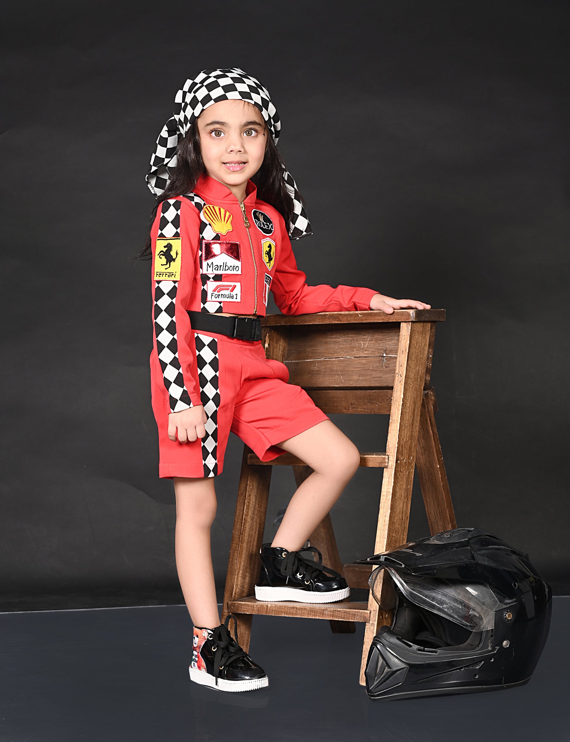 This red and black playsuit with Japanese fabric having featuring a Ferrari patch and buckle detailing with bandana, fully embellished with handmade patches and having stripes detailing on sleeves. Every element patchwork, is meticulously crafted by hand, giving this piece a unique, artisanal finishing.