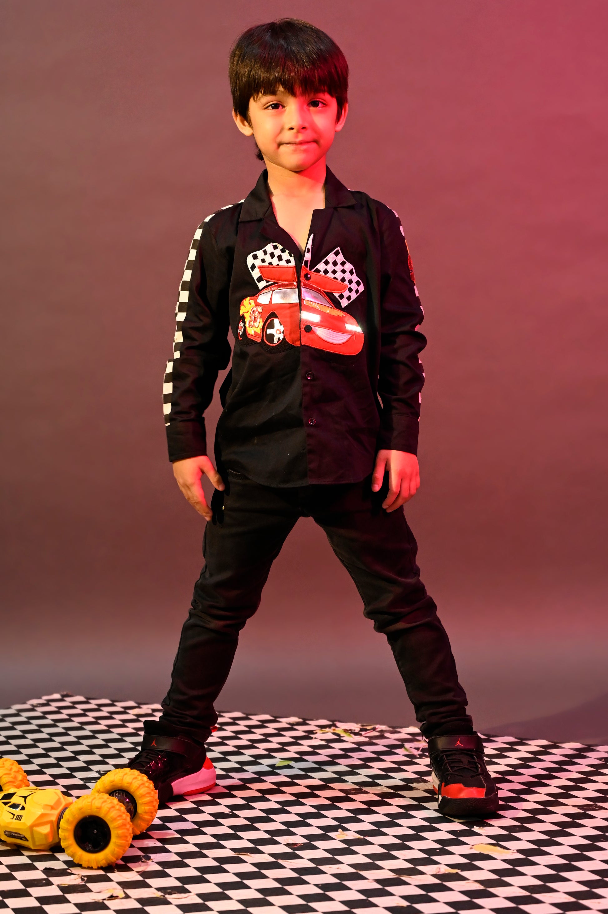 This black cotton shirt makes a bold statement with its detailed hand embroidery of a Ferrari car, brought to life with an integrated LED light. The design is elevated with check stripes on the sleeves, adding a sporty yet stylish touch. A perfect fusion of classic tailoring, handmade artistry, and innovative detailing.