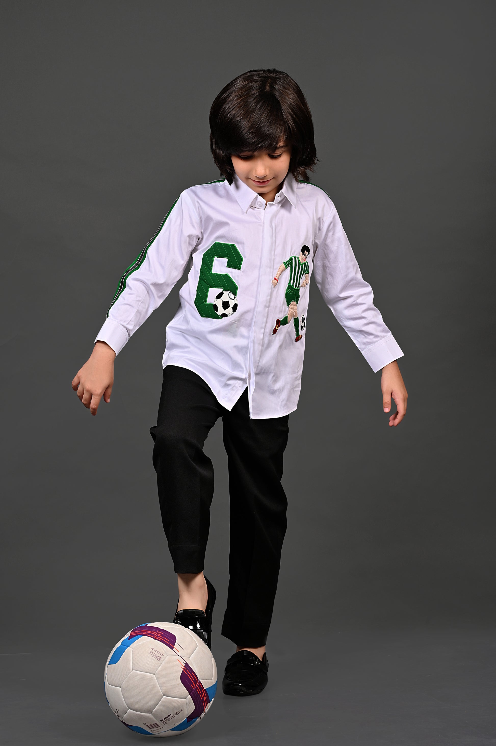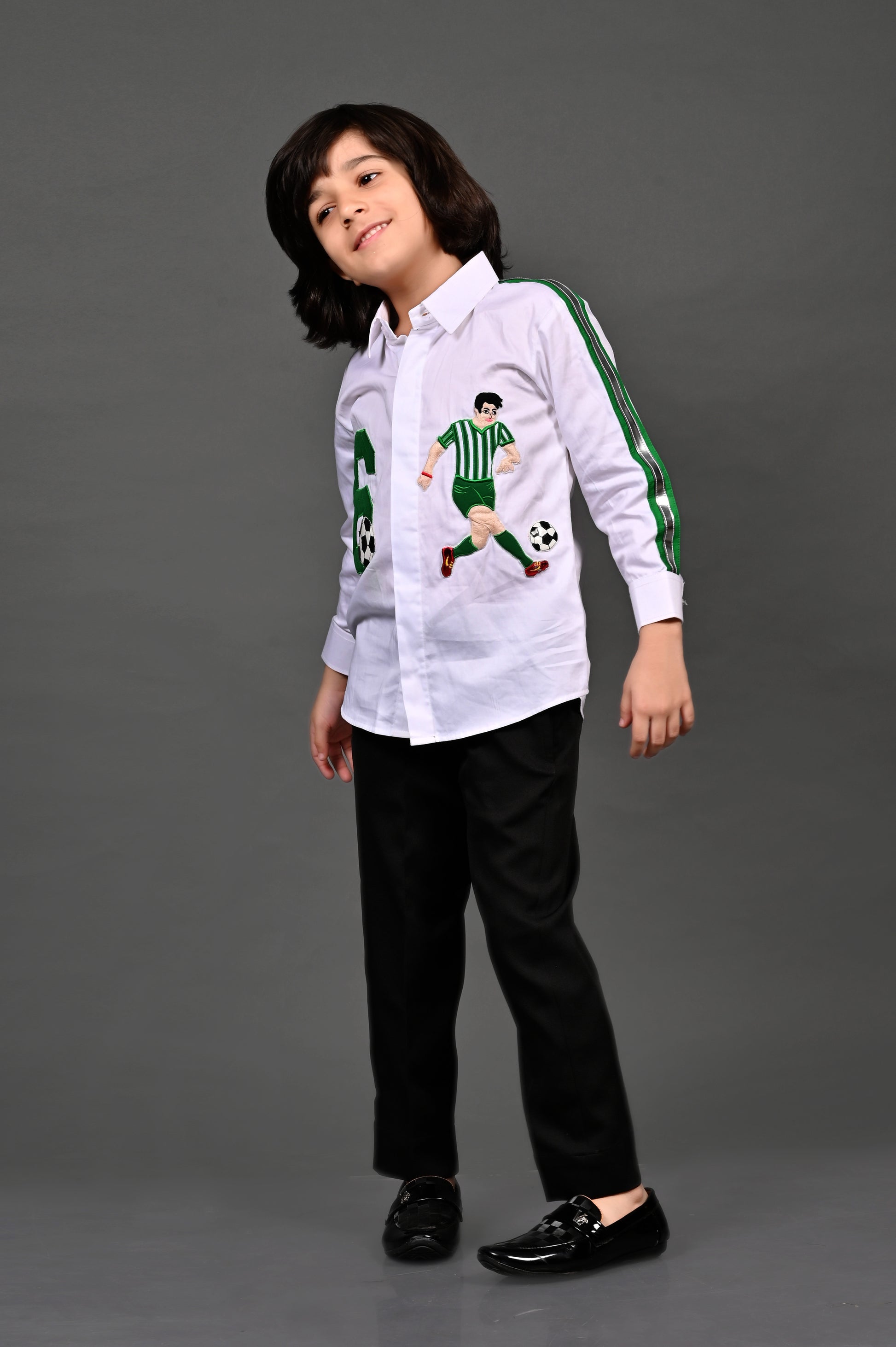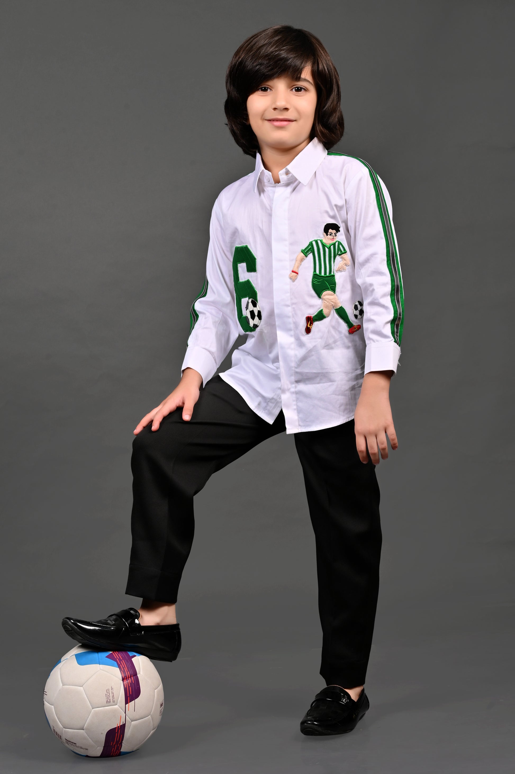 This white full-sleeve cotton shirt stands out with a bold football handwork patch detailing on the front. Designed in a classic shirt style, it is enhanced with striped detailing on the sleeves for a sporty edge. A perfect blend of casual style and handcrafted artistry.