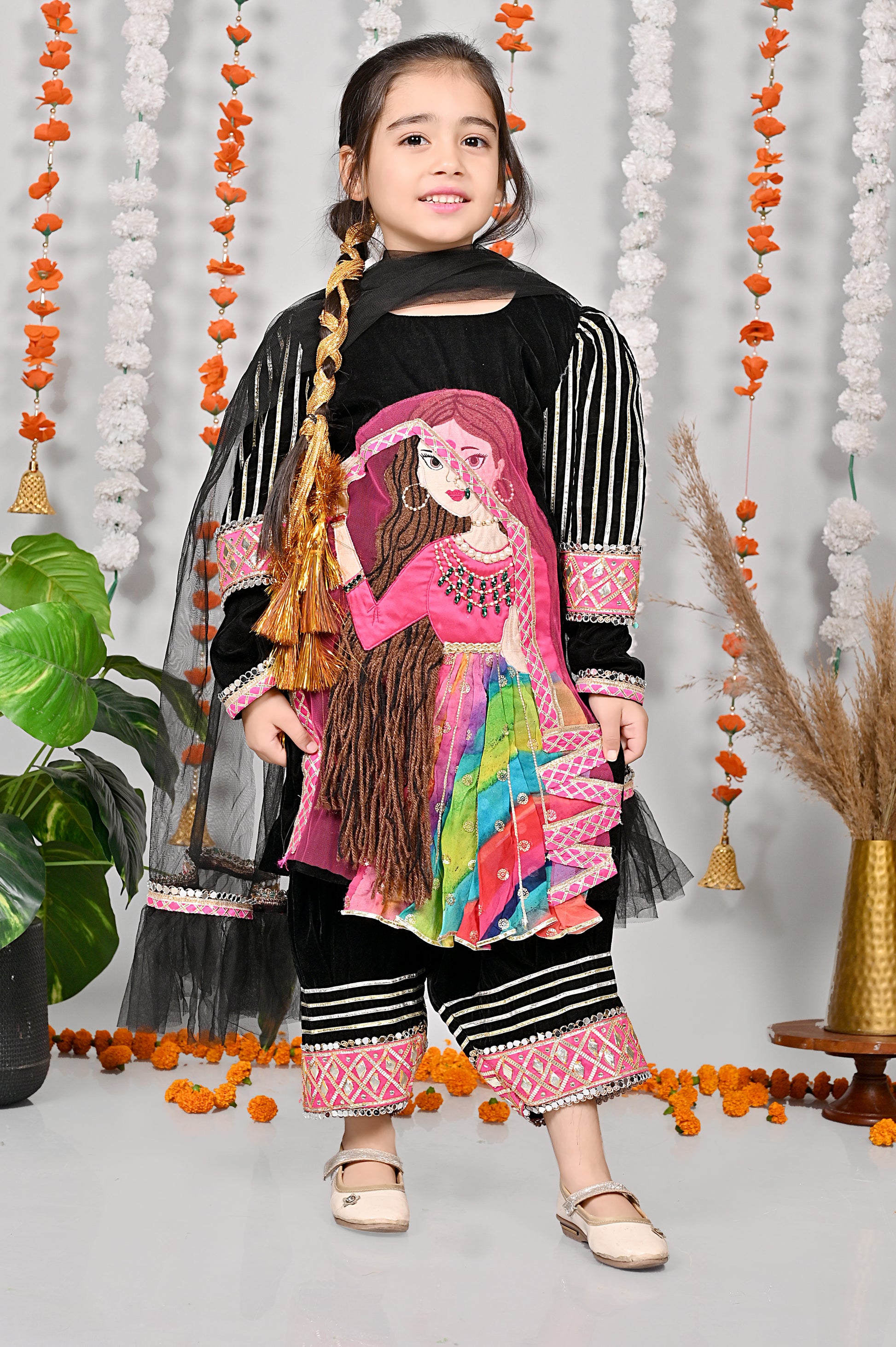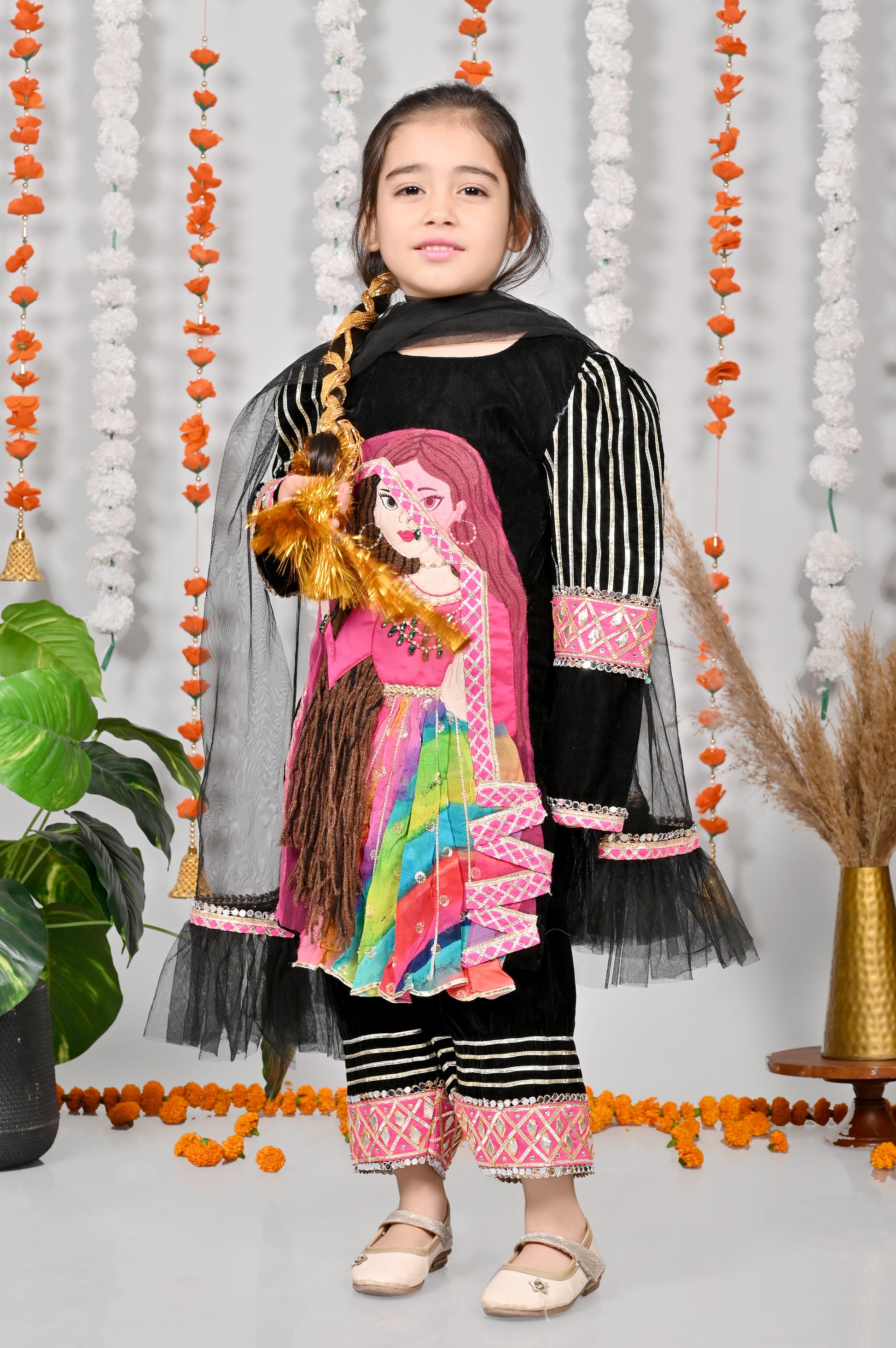 This black kurta silk set is beautifully adorned with a hand-embroidered Ghunghat Girl motif, showcasing intricate artistry and cultural charm. Paired with matching salwar pants and a dupatta, it blends traditional elegance with timeless craftsmanship. A graceful ensemble that celebrates heritage through handmade detailing.