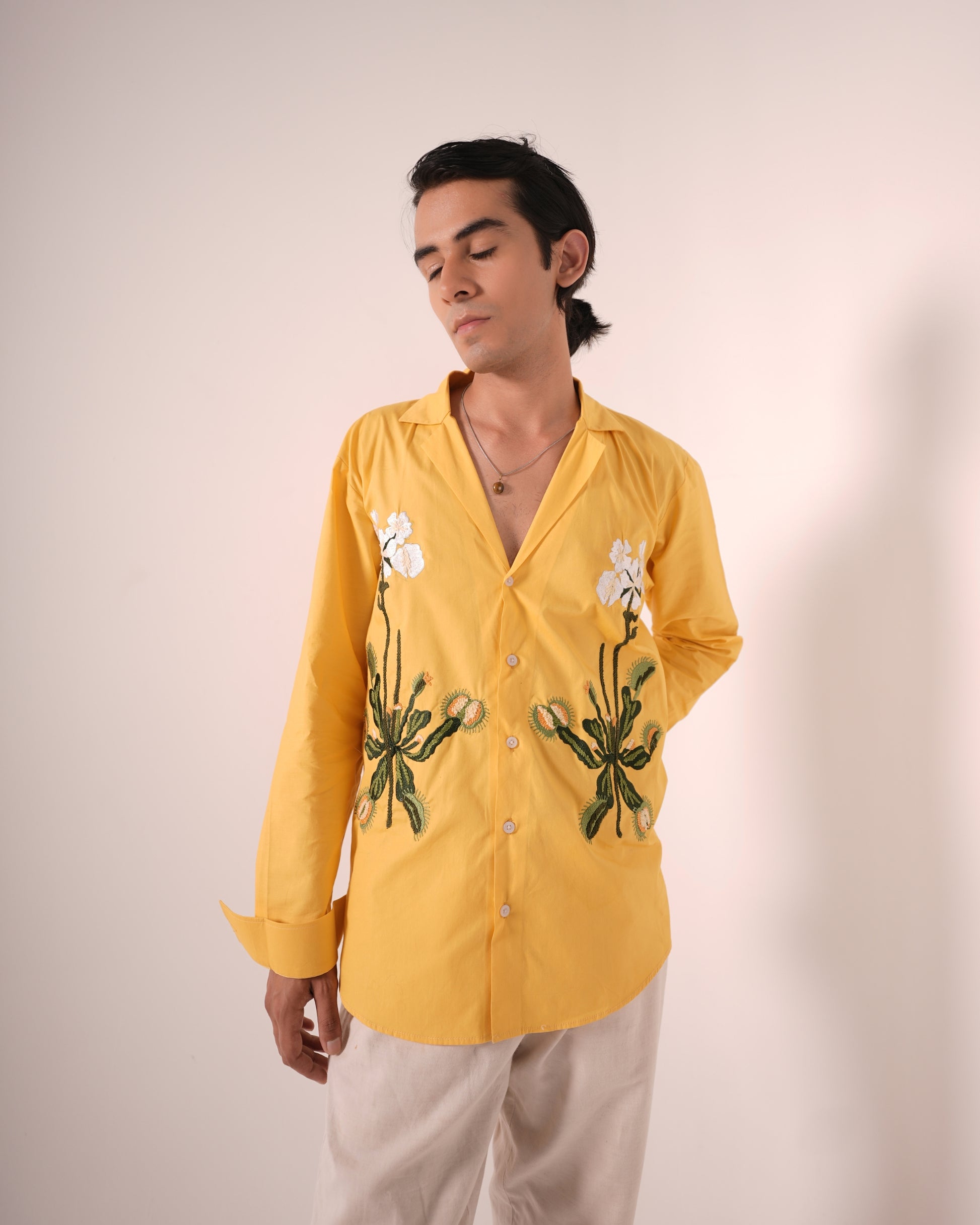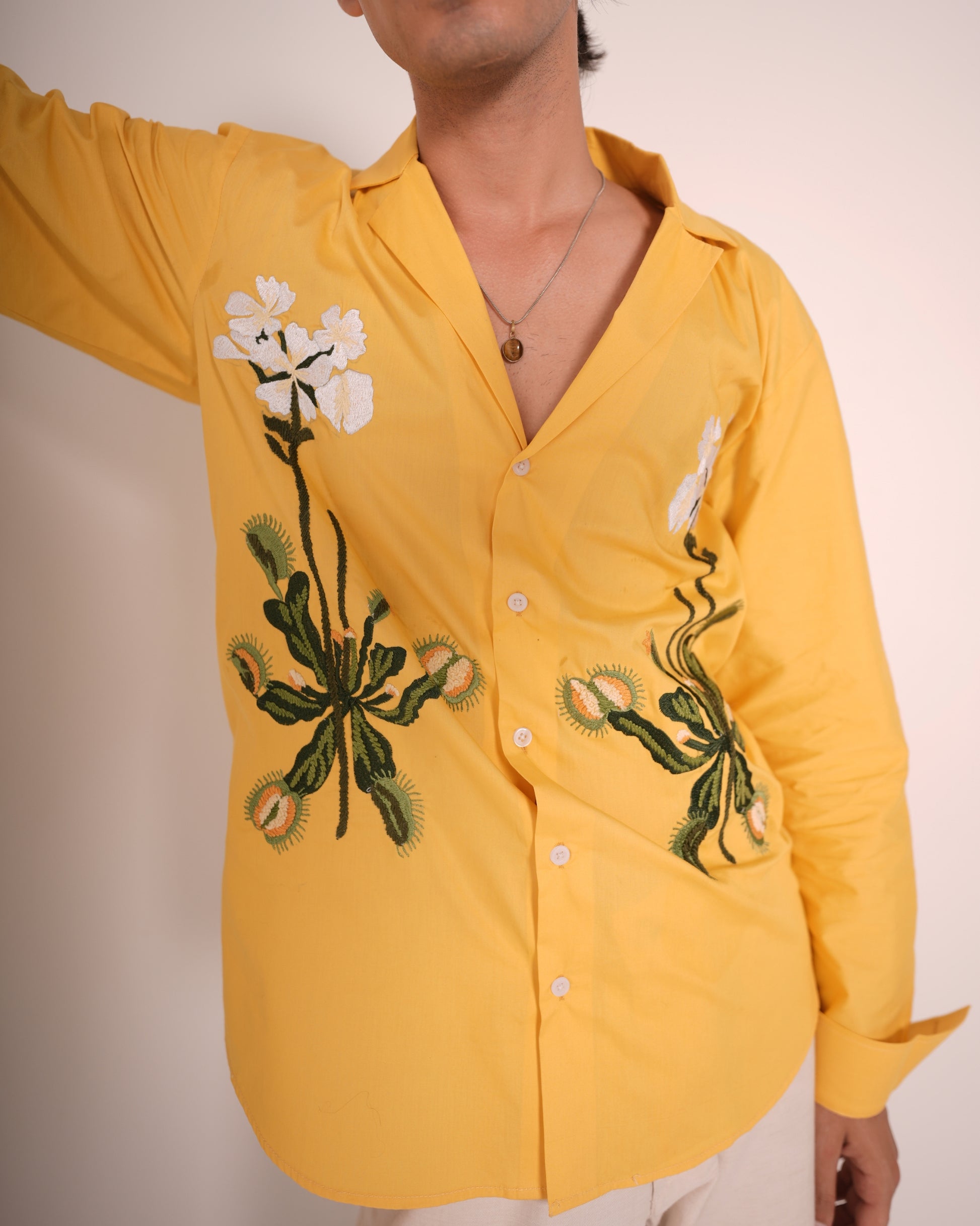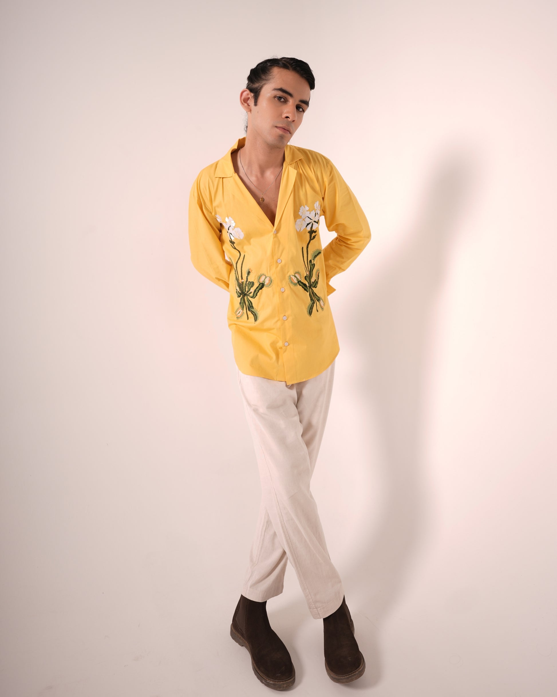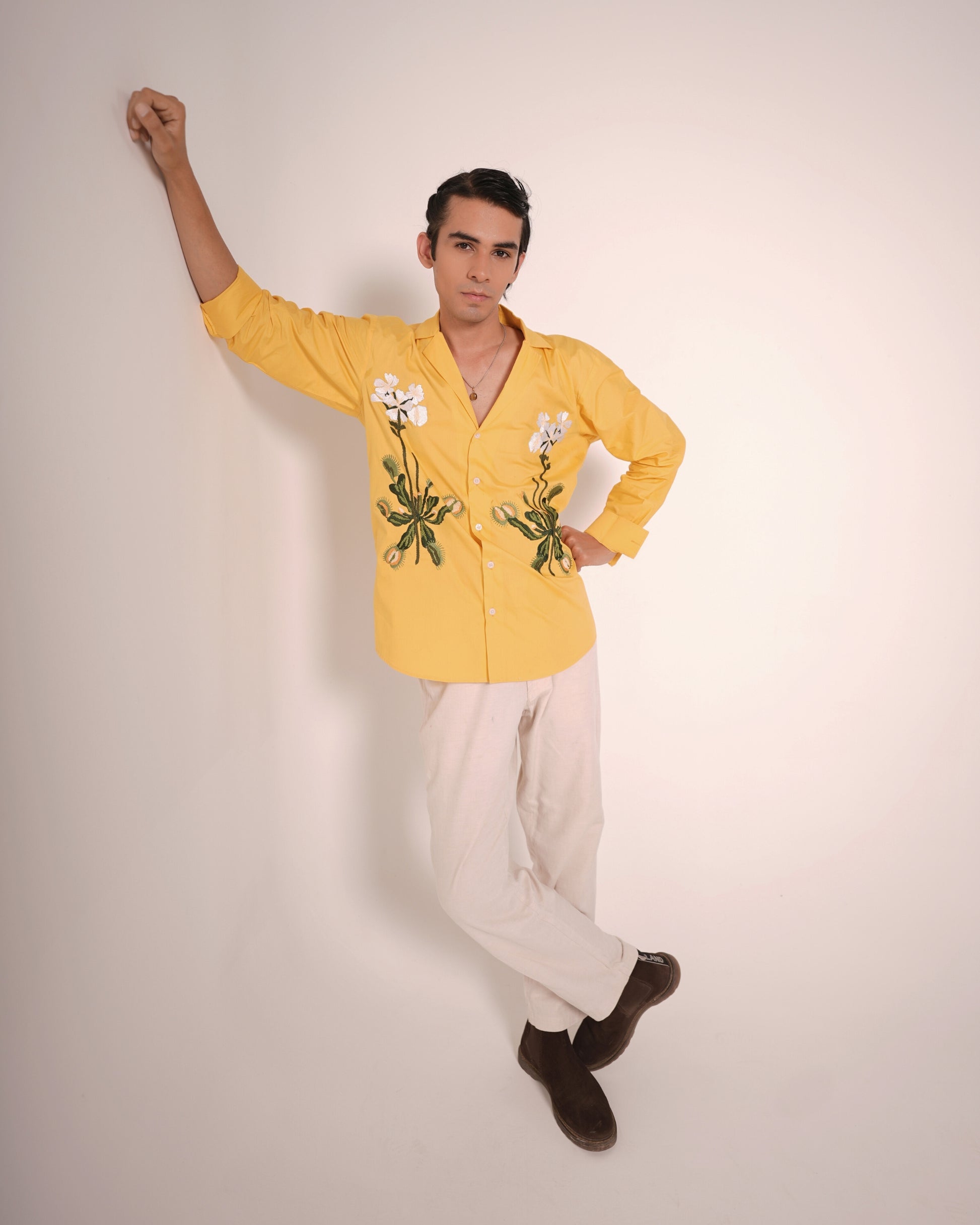Brighten your wardrobe with this cotton vibrant yellow shirt, featuring stunning hand-embroidered floral and botanical motifs. Each design is carefully crafted by skilled artisans, showcasing exceptional detail and texture. A bold yet elegant statement piece for any occasion.