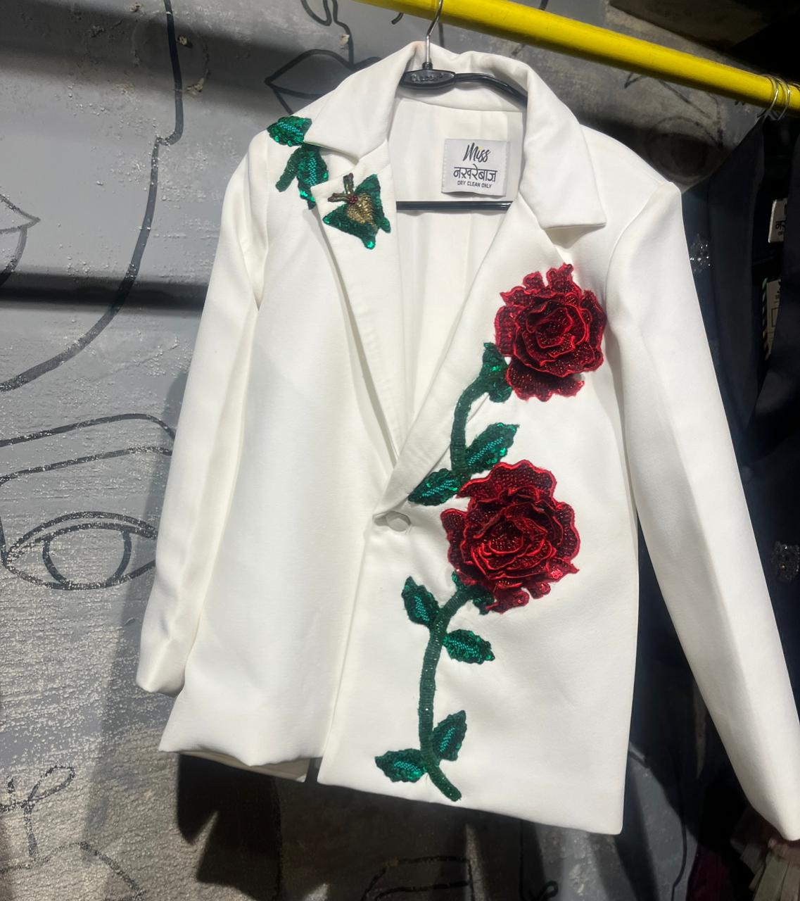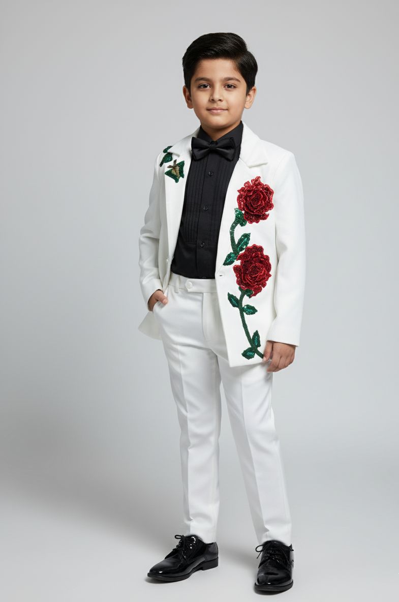 Introducing our Royal Rose Tuxedo Set, designed to bring refined elegance to every celebration. The pristine white blazer is exquisitely embellished with hand-embroidered red roses, detailed using cut-dana, sequins, and delicate threadwork for a rich, three-dimensional finish. Paired with a formal tailored pant, classic pin-tuck shirt, and a sleek bow tie, it creates a perfectly coordinated look. Ideal for weddings, festive gatherings, birthdays, and ceremonial occasions. A timeless ensemble that ensures your young gentleman stands out with poise and sophistication.