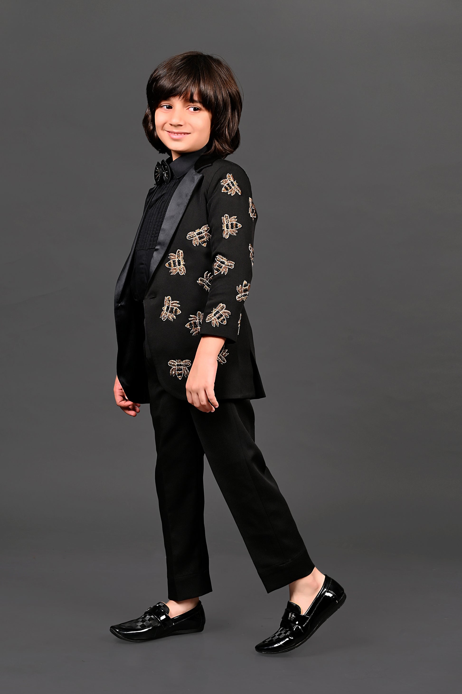 A smart formal fabric black blazer set crafted for special occasions, featuring a charming honeybee hand-embroidered with metallic thread embroidery embellished motif on the blazer. Paired with a crisp shirt, matching pants, and a stylish bow, this outfit blends elegance with playful detailing.