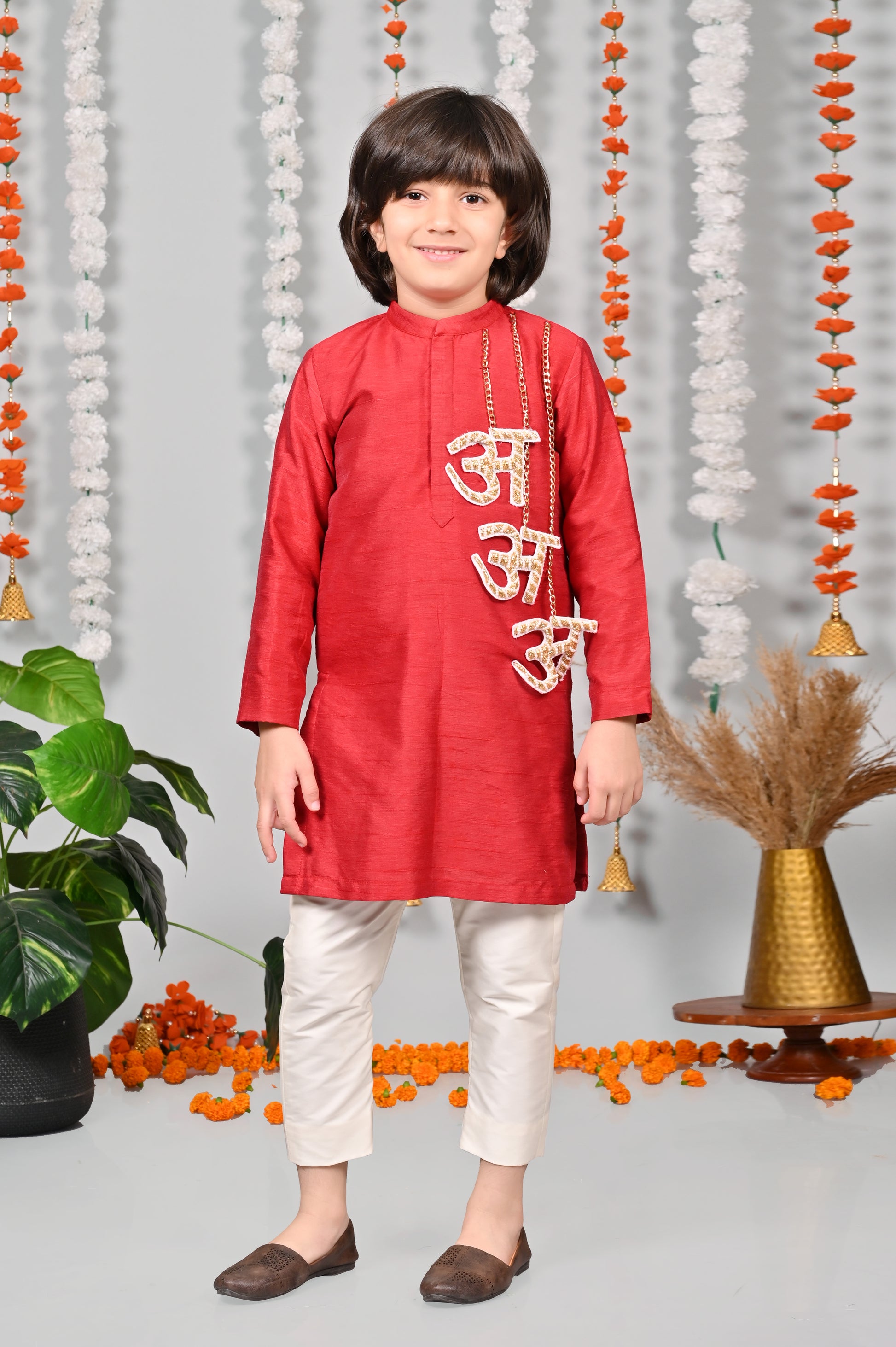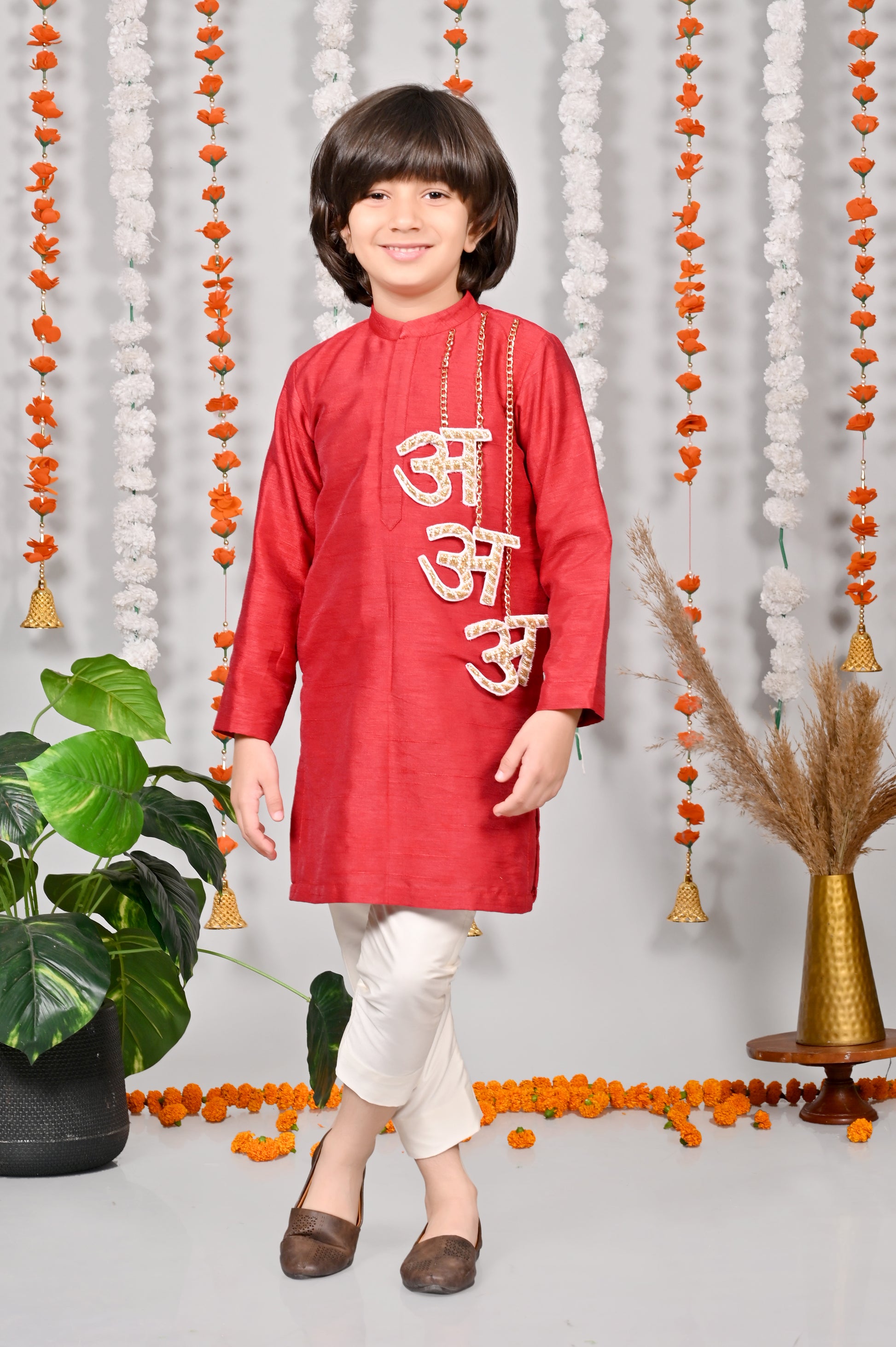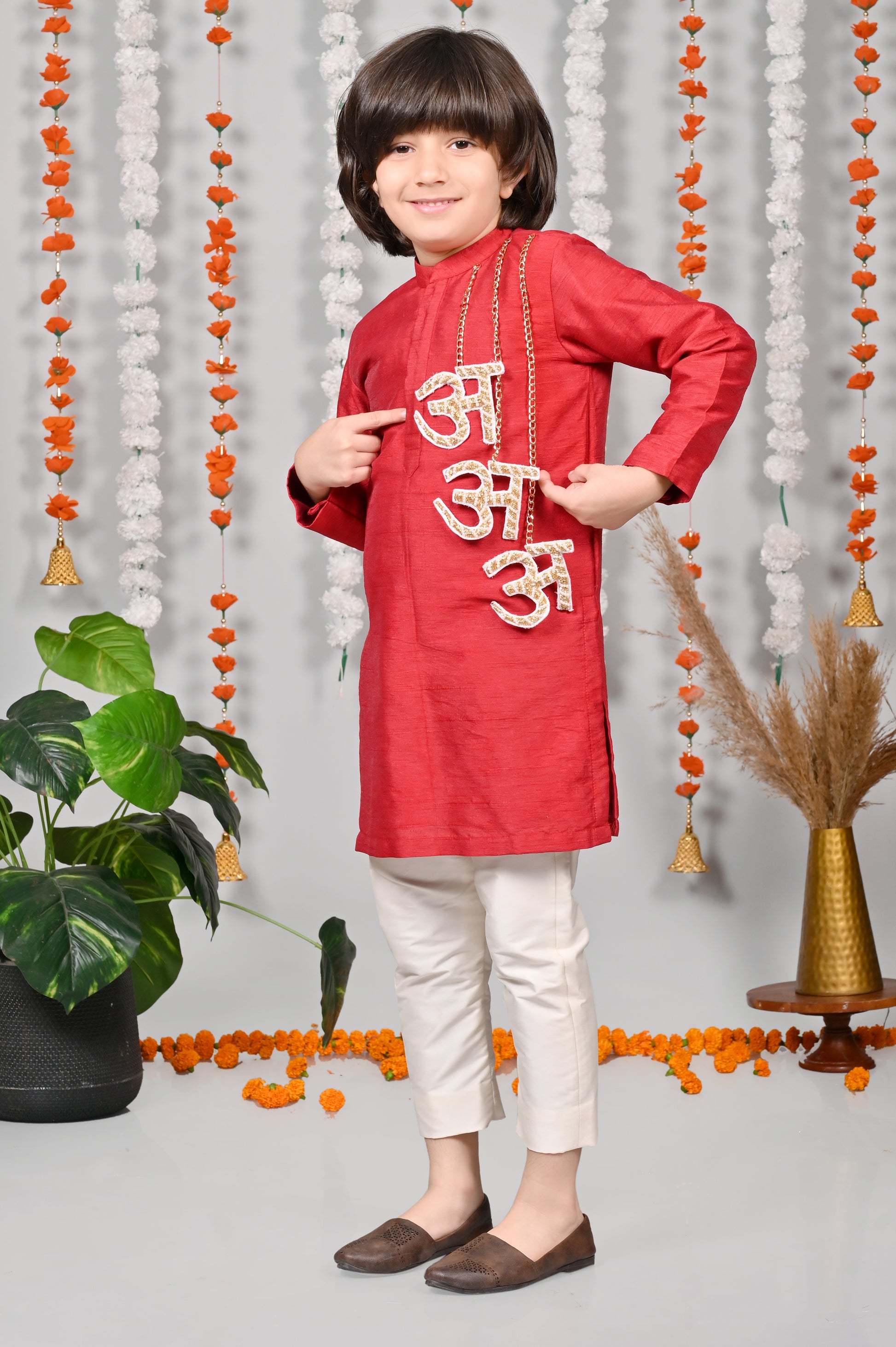 A vibrant red cotton kurta paired with off-white pants, featuring exquisite initial letter motifs handcrafted with sparkling cut-dana and delicate beads. Every detail on the kurta is meticulously handmade, creating a striking combination of tradition and contemporary style. Perfect for festive occasions or special celebrations, this ensemble showcases artisanal craftsmanship at its finest.