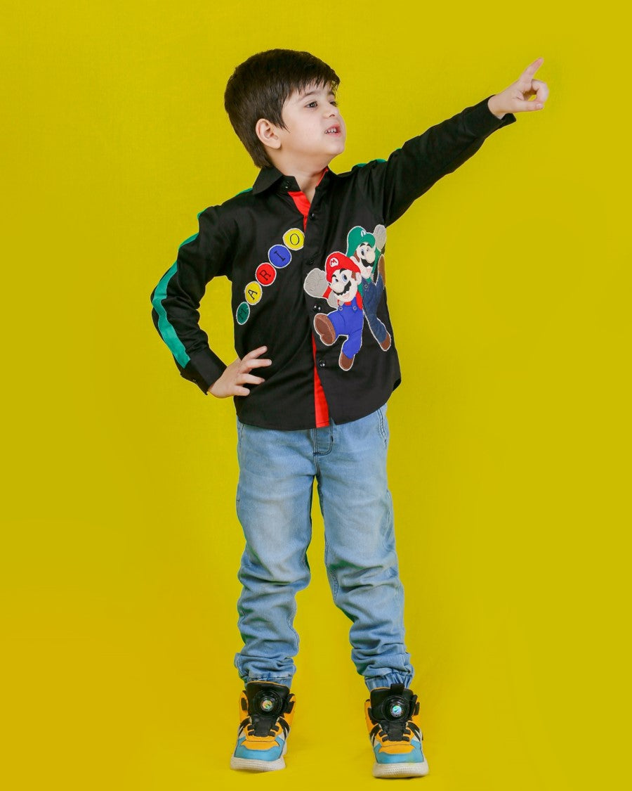 This classic black shirt featuring a MARIO patch with detailed lettering and full-sleeve stripe patch accents, all meticulously handcrafted. Every patch and stitch showcases expert handwork, making this shirt a stylish and artisanal statement piece for kids