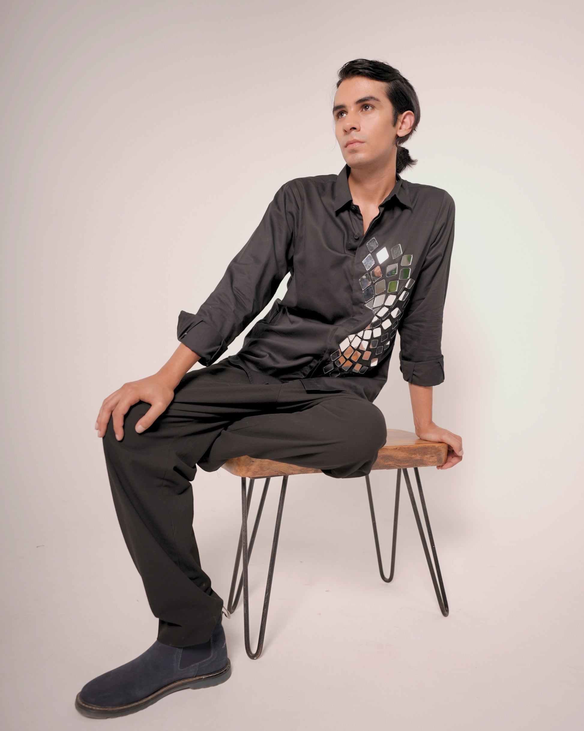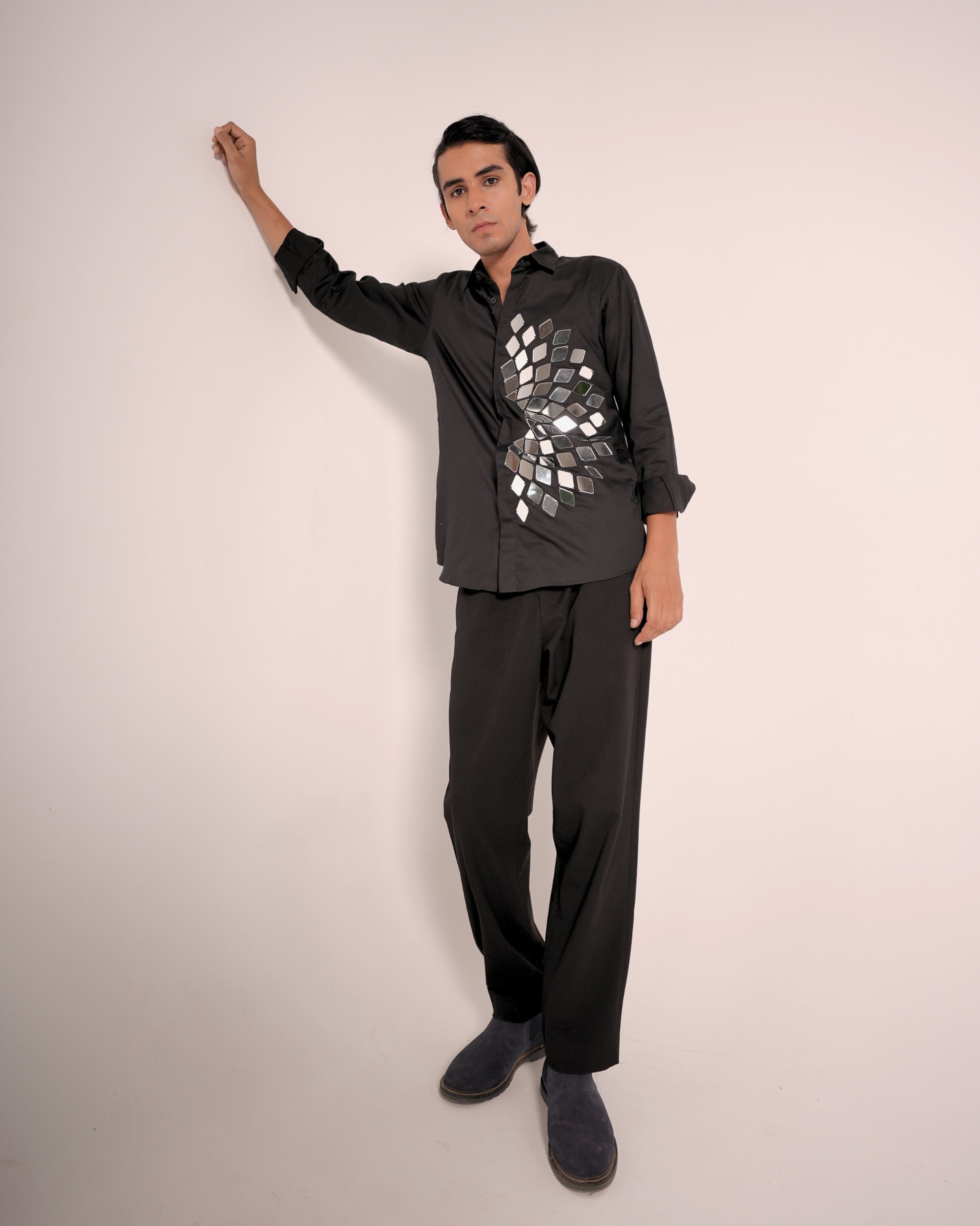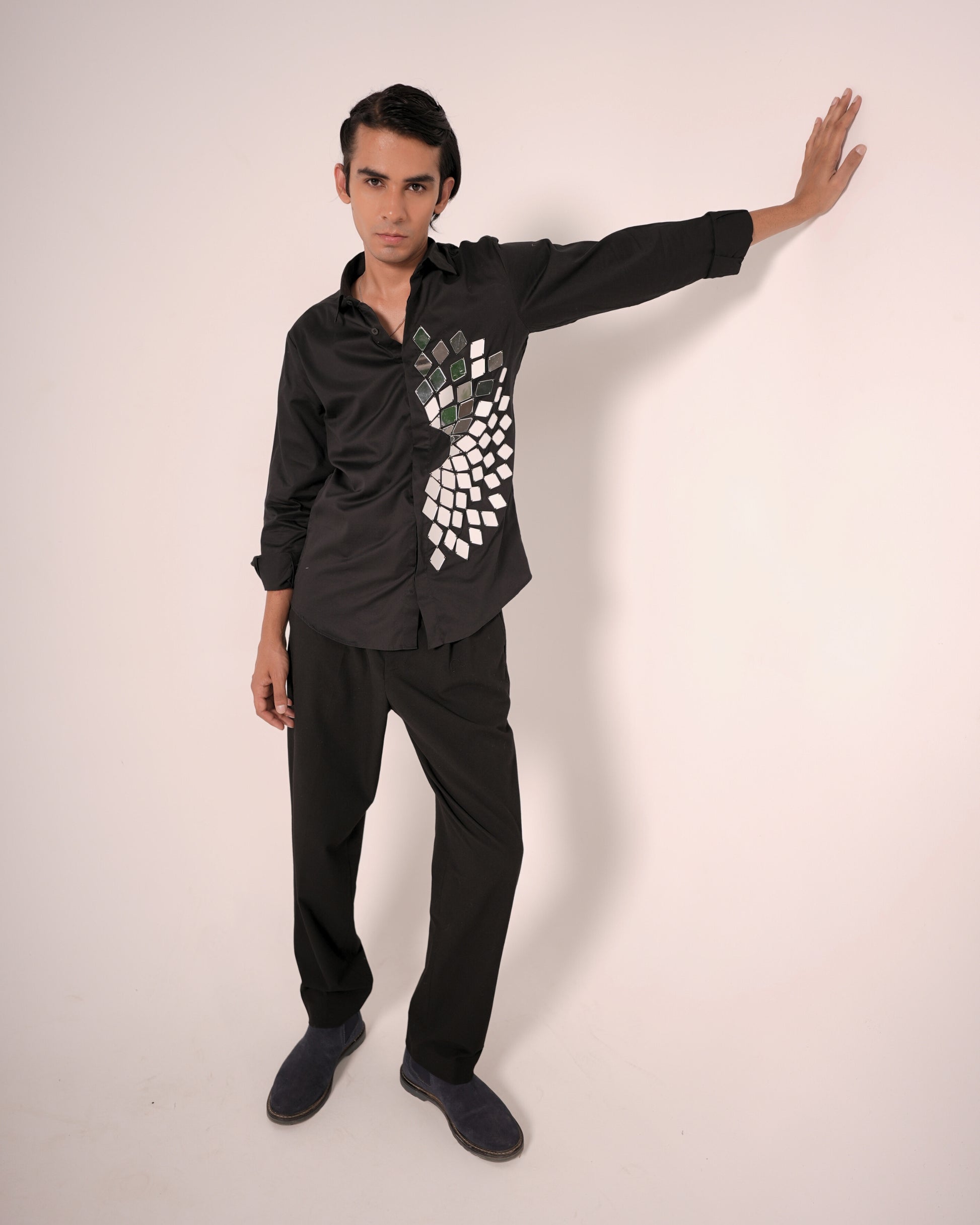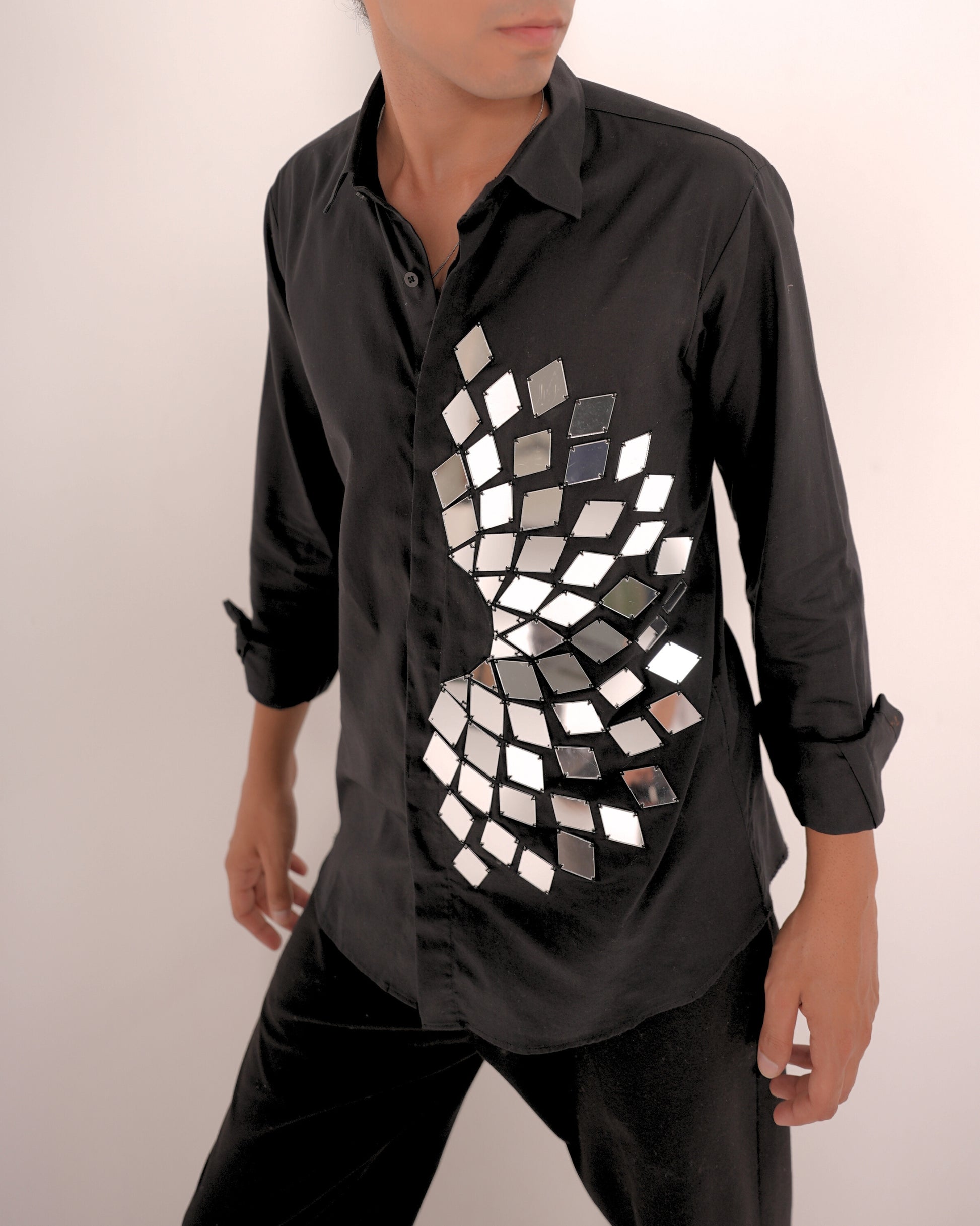 Make a bold statement with this black cotton button-up shirt featuring hand-attached mirror pieces in a dynamic spiral pattern. Each mirror is meticulously placed to create a reflective, eye-catching effect that moves with you. Perfect for fashion-forward events, performances, or a night out when you want to shine—literally.