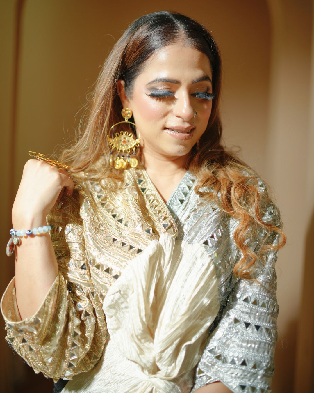 This kaftan-inspired crushed silk dress features a graceful draped silhouette with exquisite handmade craftsmanship. Adorned with intricate mirror detailing, it brings a touch of sparkle and tradition to its modern design. A perfect fusion of elegance, artistry, and timeless charm for special occasions.