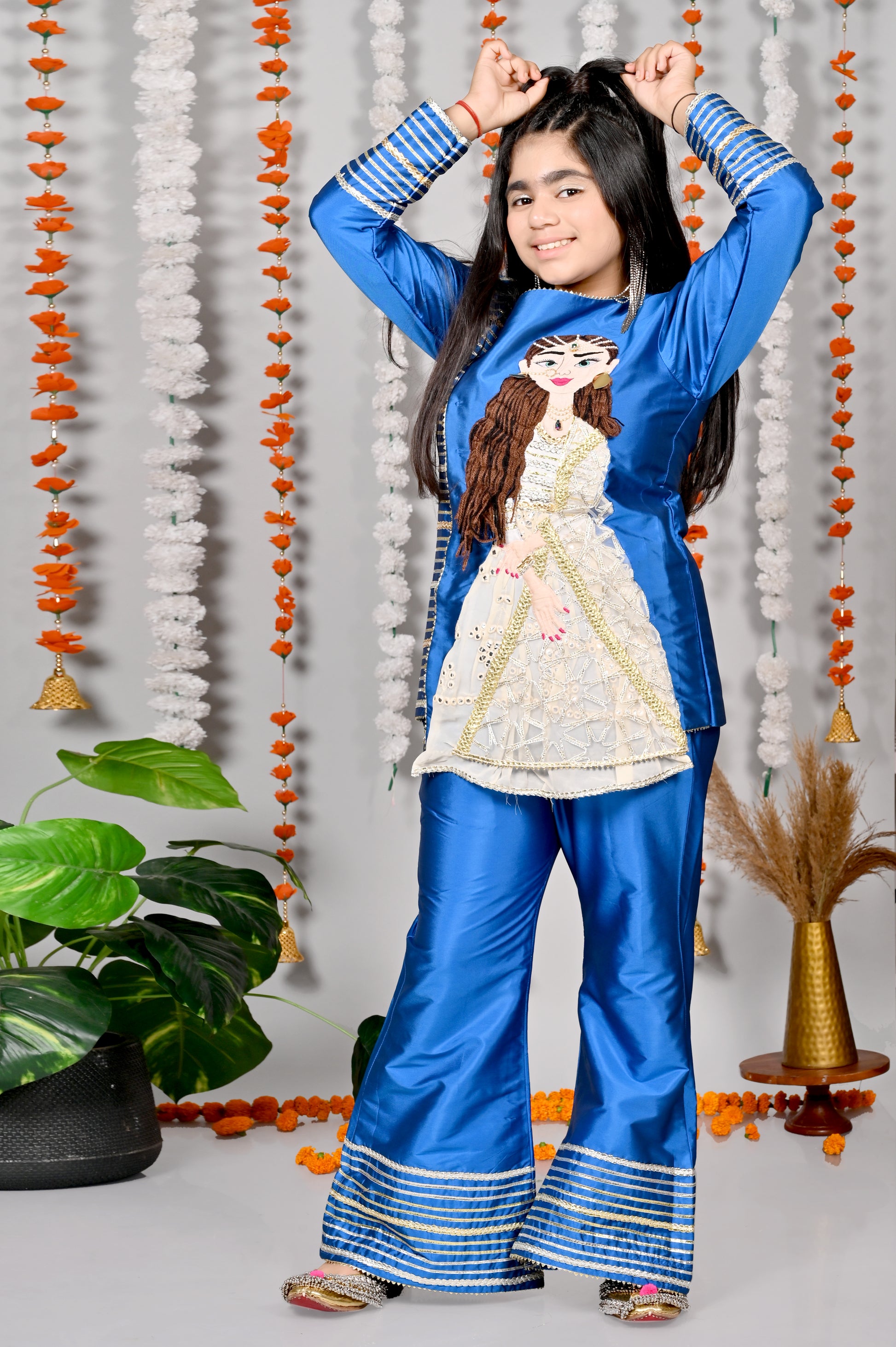 This royal blue silk ensemble features a stunning Noor Girl motif in hand embroidery on the top, paired with elegant bell-bottom pants. Adorned with sparkling crystals, every detail is handcrafted to perfection. A dazzling fusion of artistry and glamour, perfect for making a statement at special occasions.