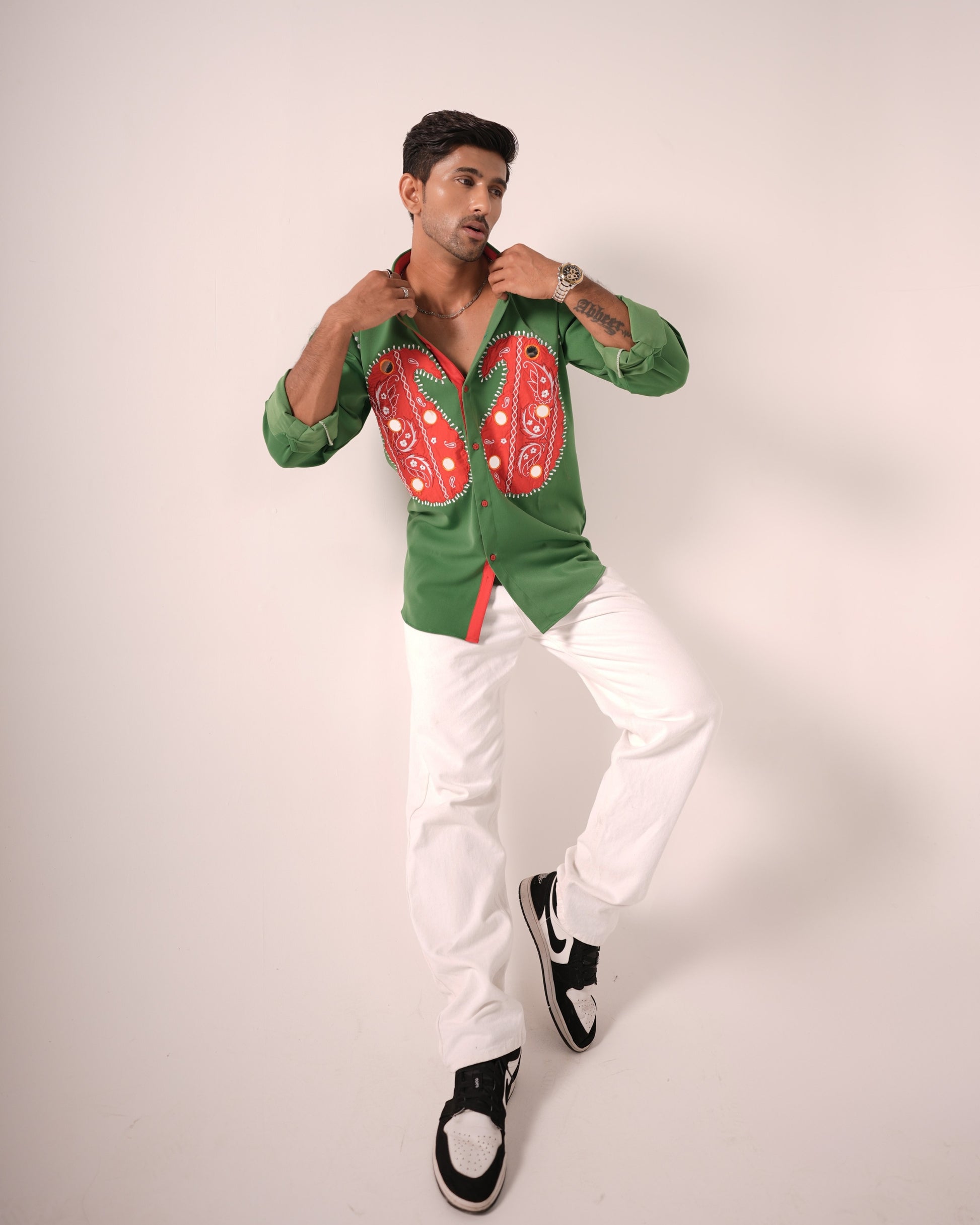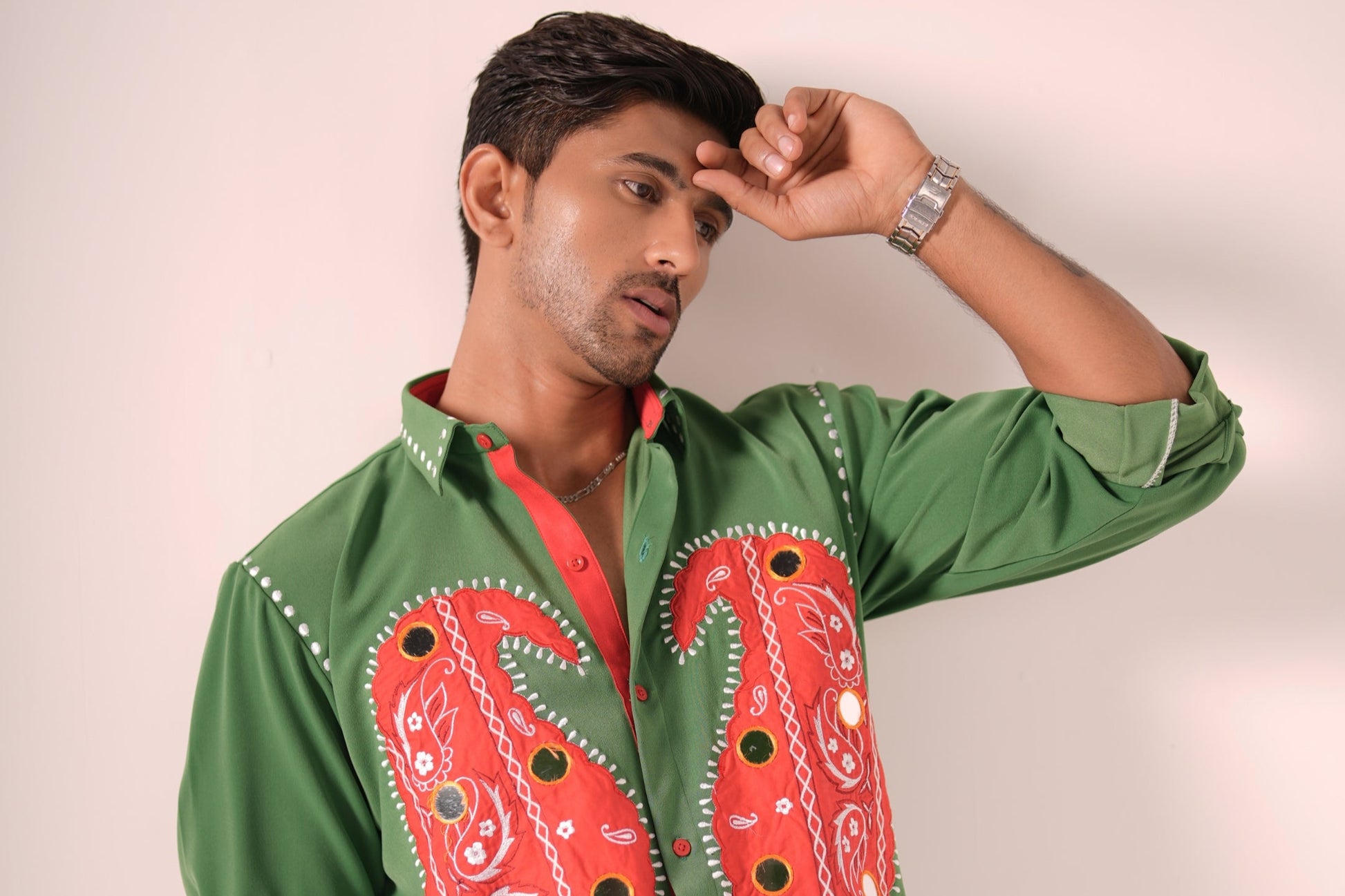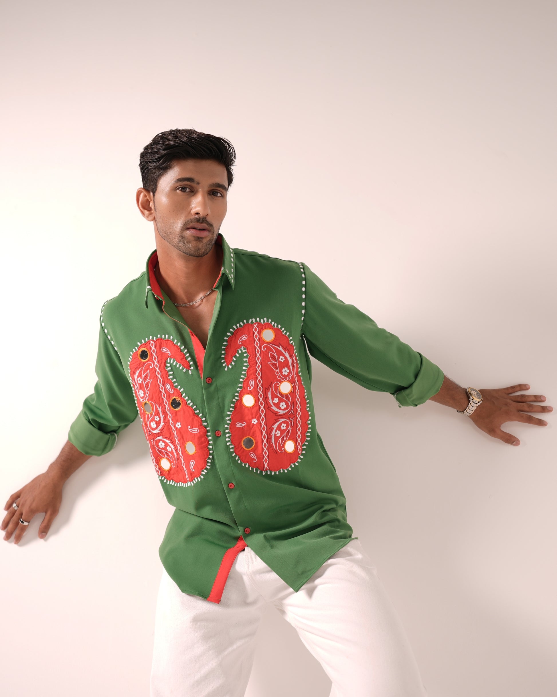 This vibrant green cotton shirt features bold hand-embroidered paisley motifs accented with intricate mirror work for a striking traditional touch. Every detail is carefully handcrafted, celebrating artisanal skill and cultural heritage. A statement piece that blends rich texture with festive charm