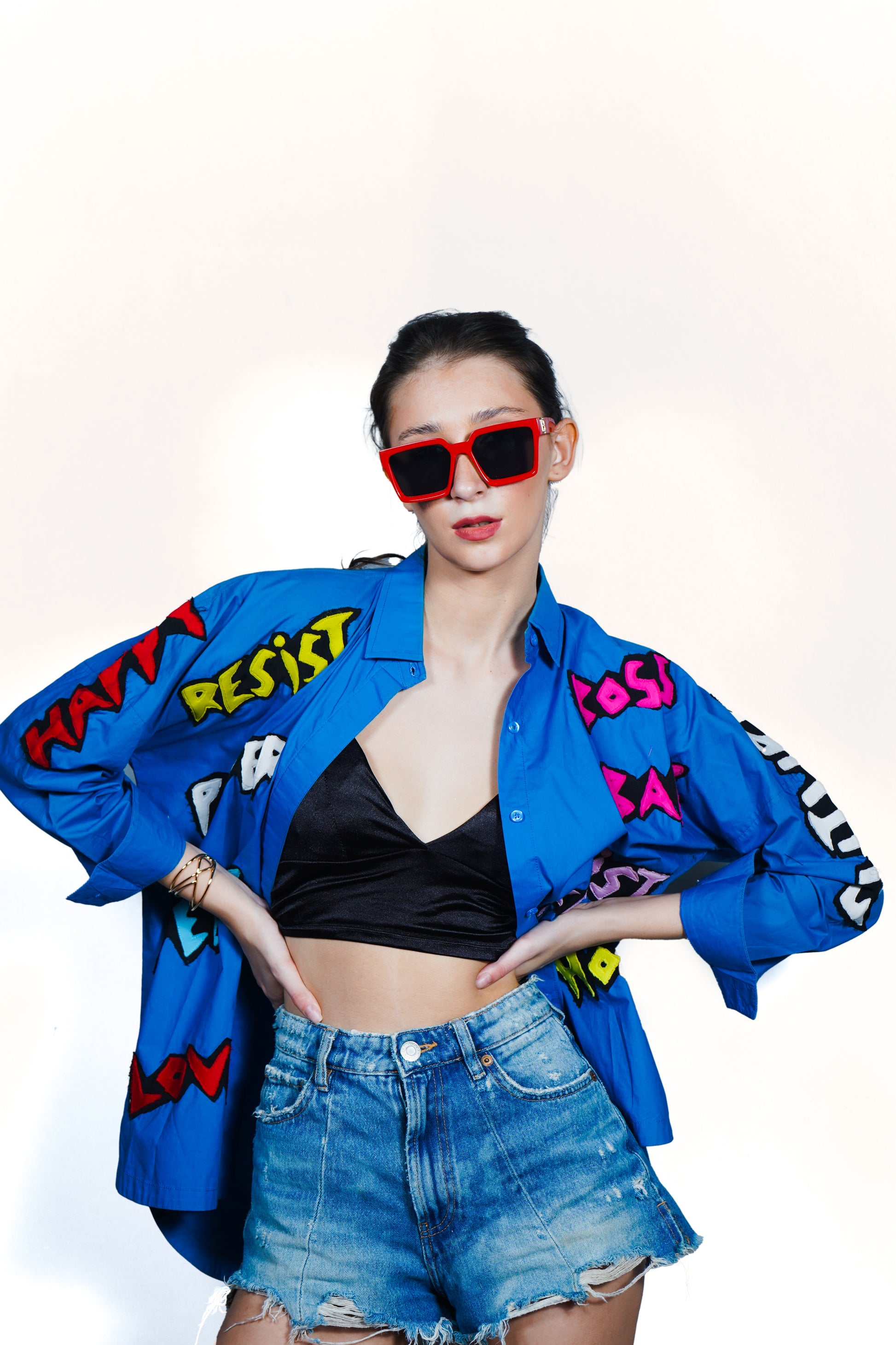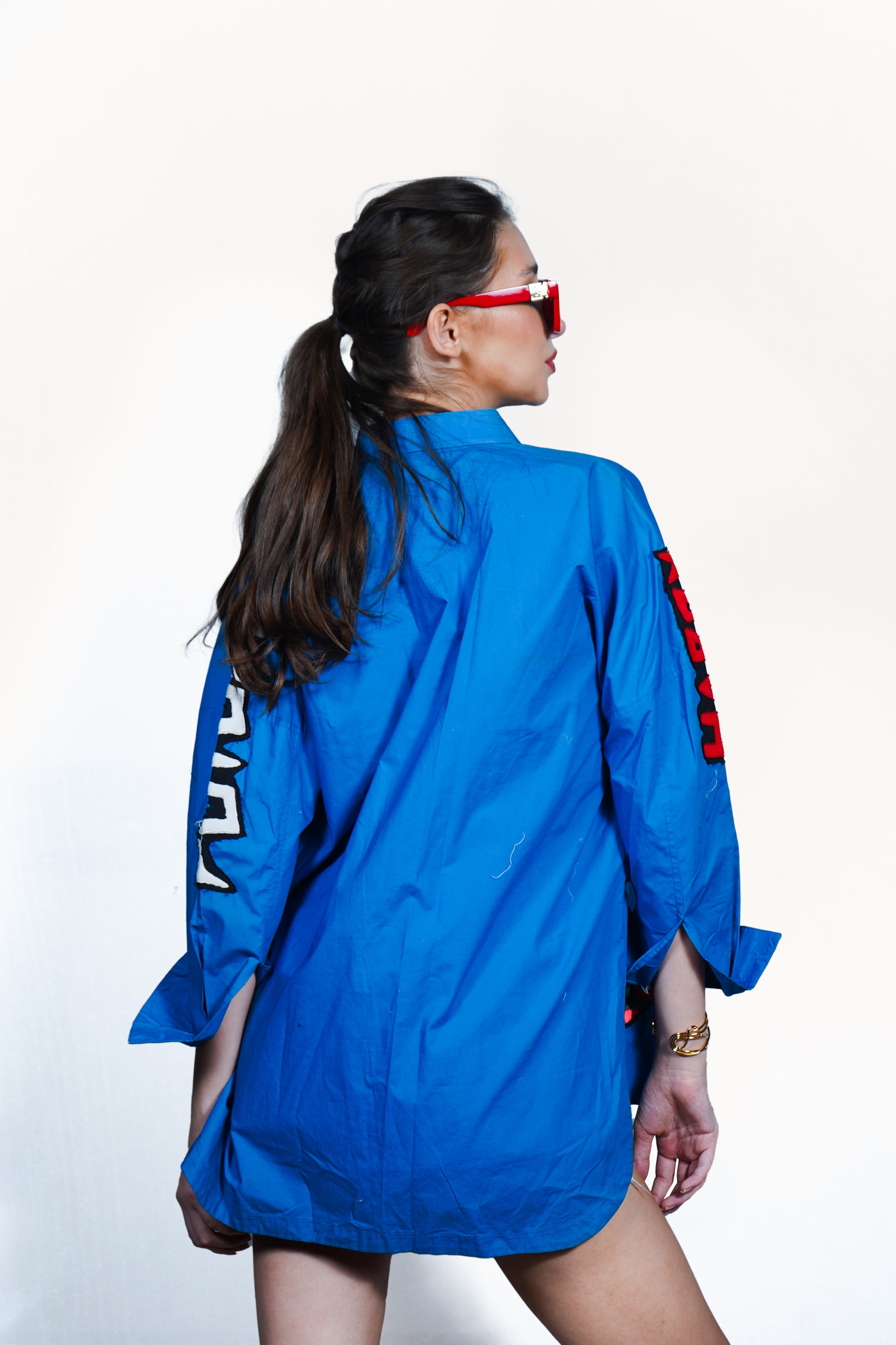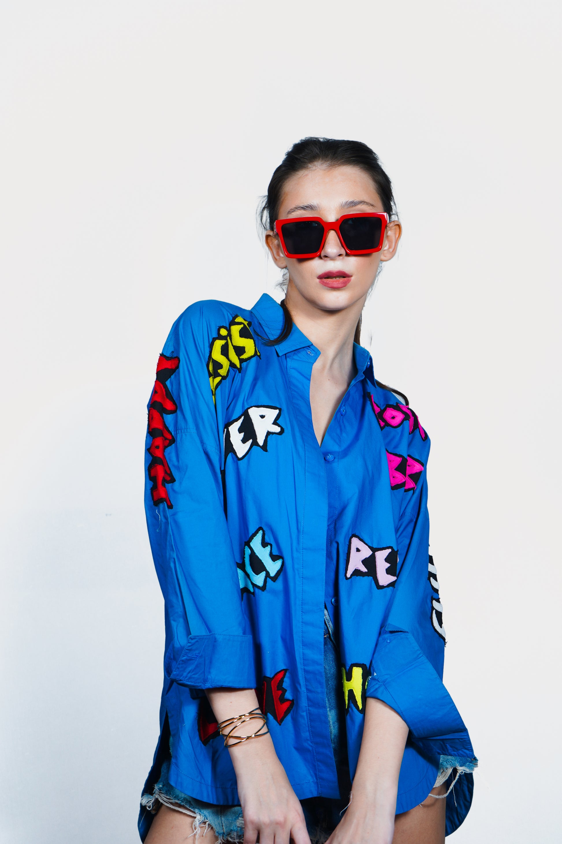 The ‘Patch Drip’ cotton shirt is where bold meets breathable. With statement patches and effortless drip, it’s made to turn sidewalks into runways—one stitched vibe at a time.this vibrant blue shirt comes with a multicolour hand work patches on it