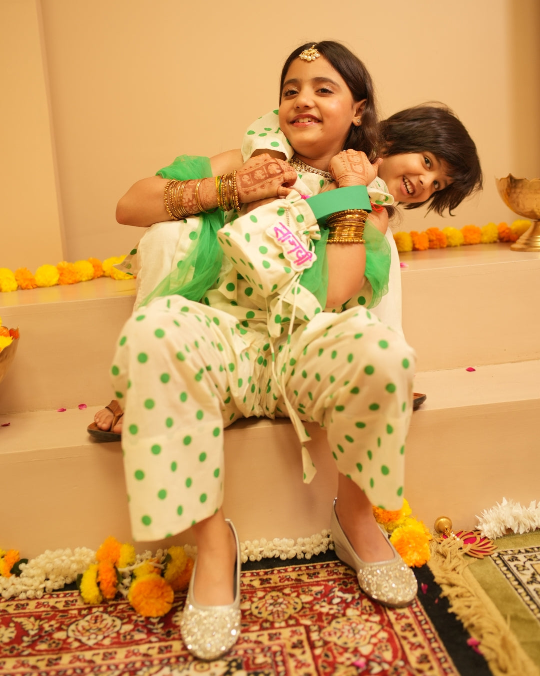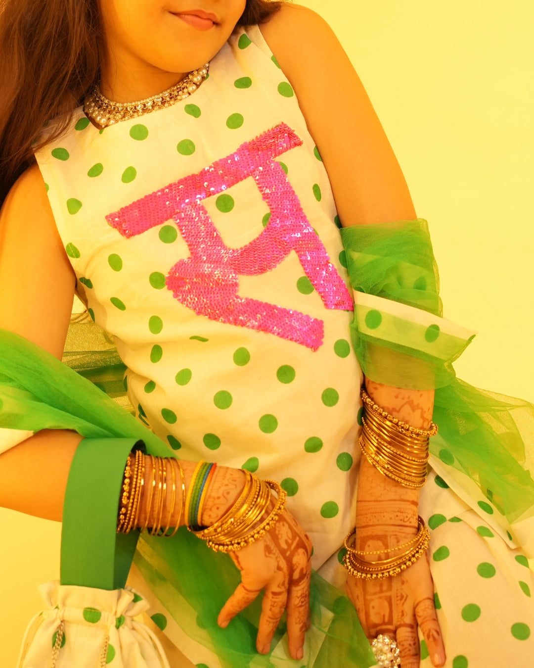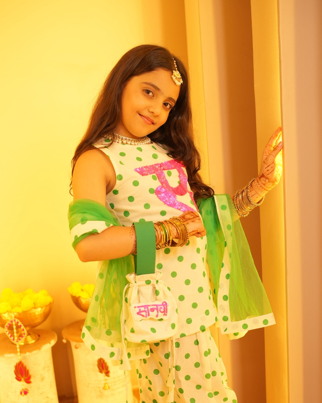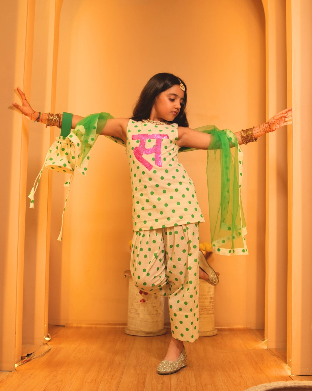 An elegant off-white girls' cotton salwar suit with a polka-dotted kurta and salwar, paired with a green dupatta with handmade letters embellished and can be personalised . A matching handmade potli for a special touch.Perfect for festive season.