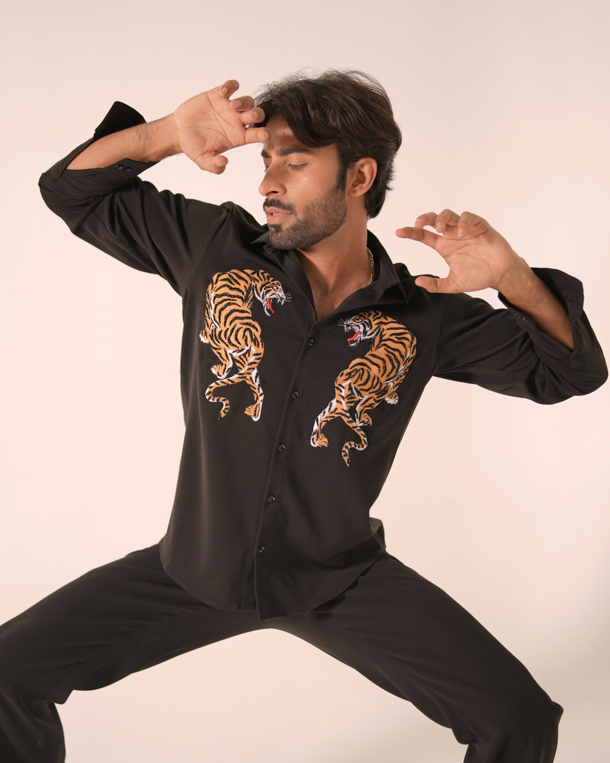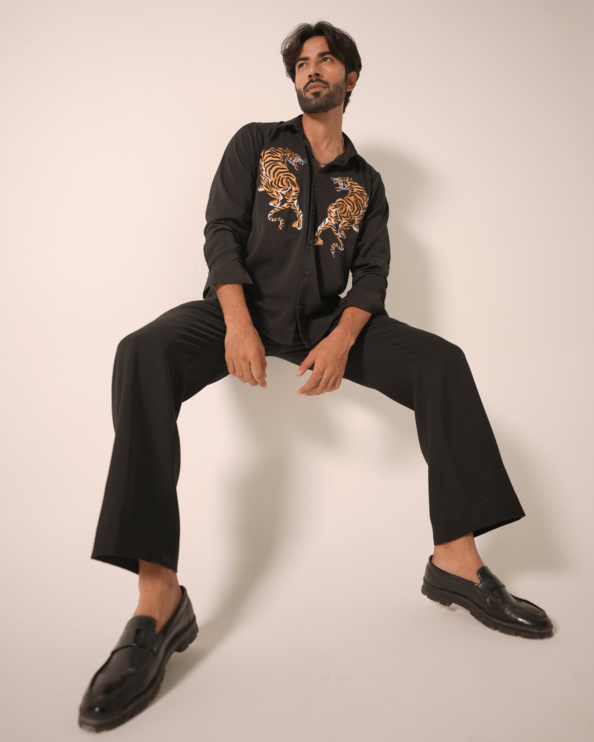 Elevate your formal wardrobe with this sleek black shirt featuring hand-embroidered twin lions on each side. The intricate handmade embroidery symbolises strength and power, making it a statement piece that fuses elegance with bold style. Perfect for making a confident impression in any formal setting.