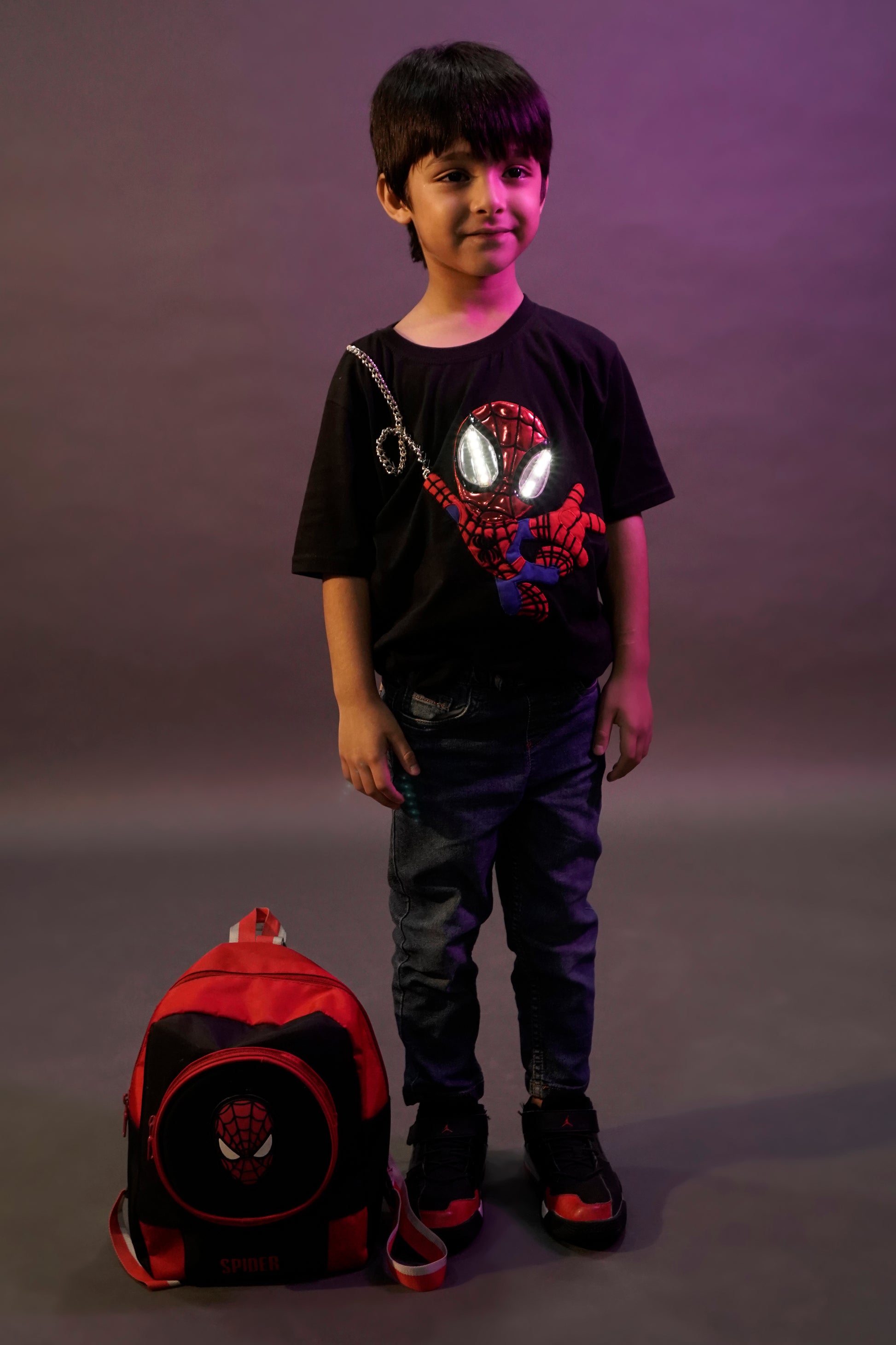 This black Spiderman T-shirt makes a powerful statement with its handwork patch detailing on the front, paired with edgy chain accents and LED light features. Blending comfort with bold craftsmanship, it transforms casual wear into a standout piece. A perfect mix of superhero style and innovative handmade design.
