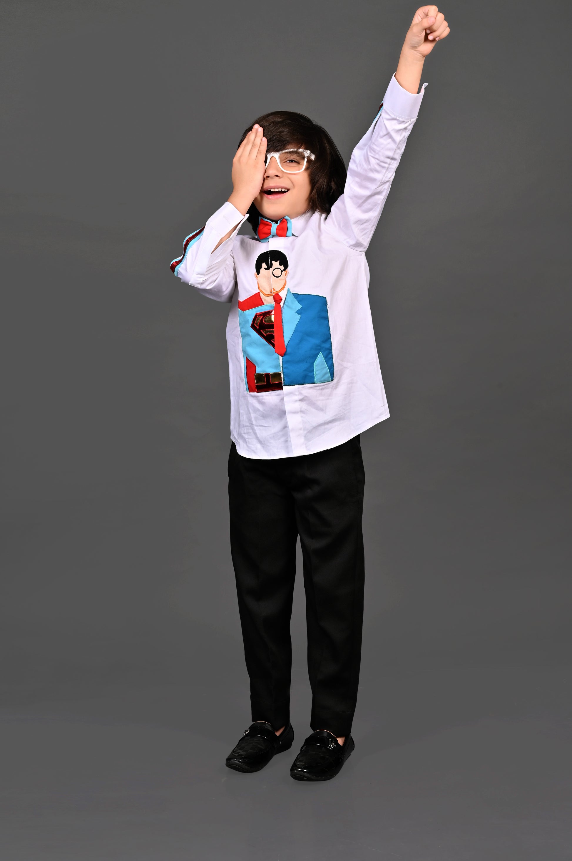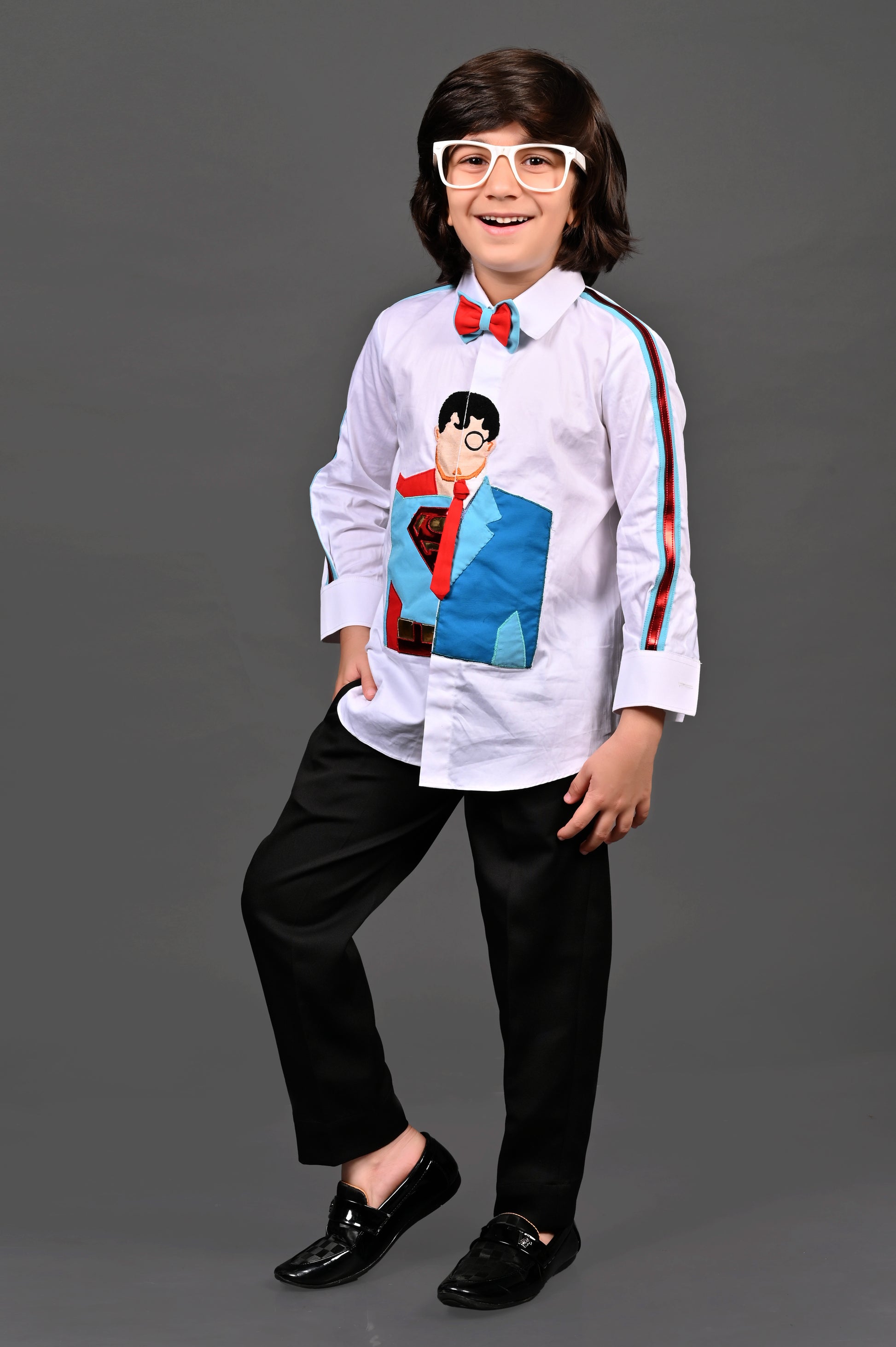 This white cotton full-sleeve shirt showcases Superman handwork patch detailing on the front and back, enhanced with intricate hand embroidery for added depth and artistry. Styled in a classic shirt silhouette, it blends comfort with bold handmade craftsmanship. A statement piece that celebrates style with a superhero edge.