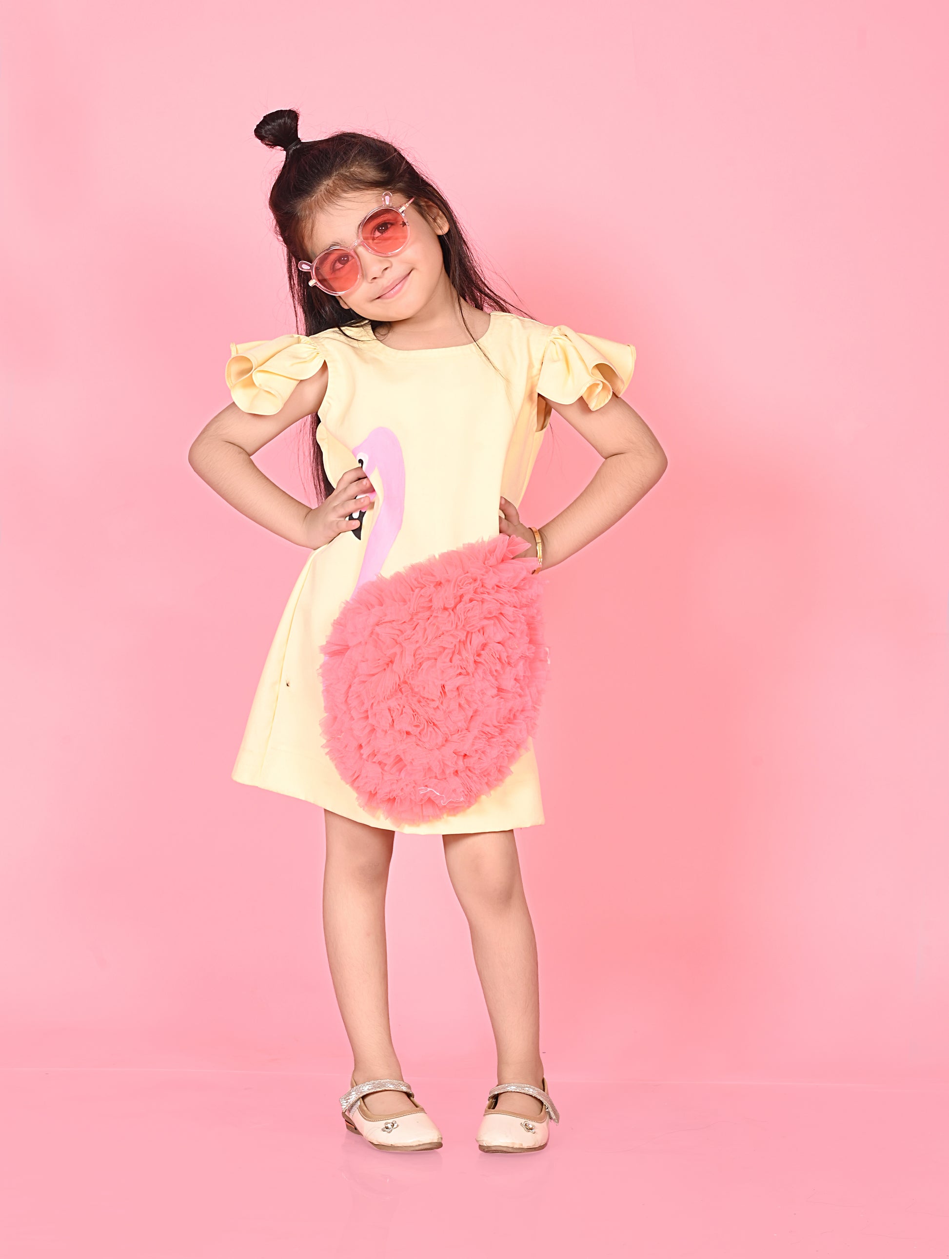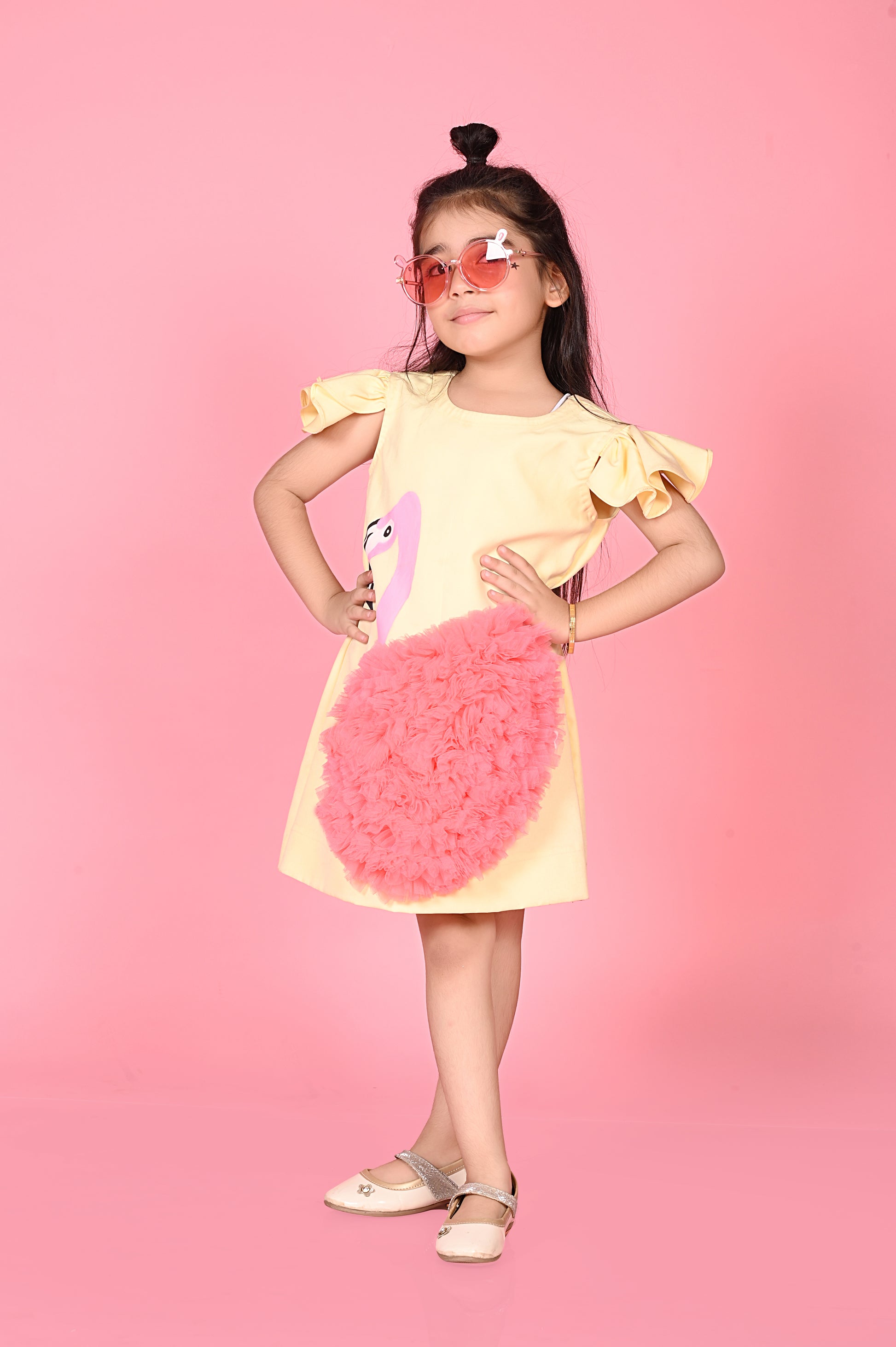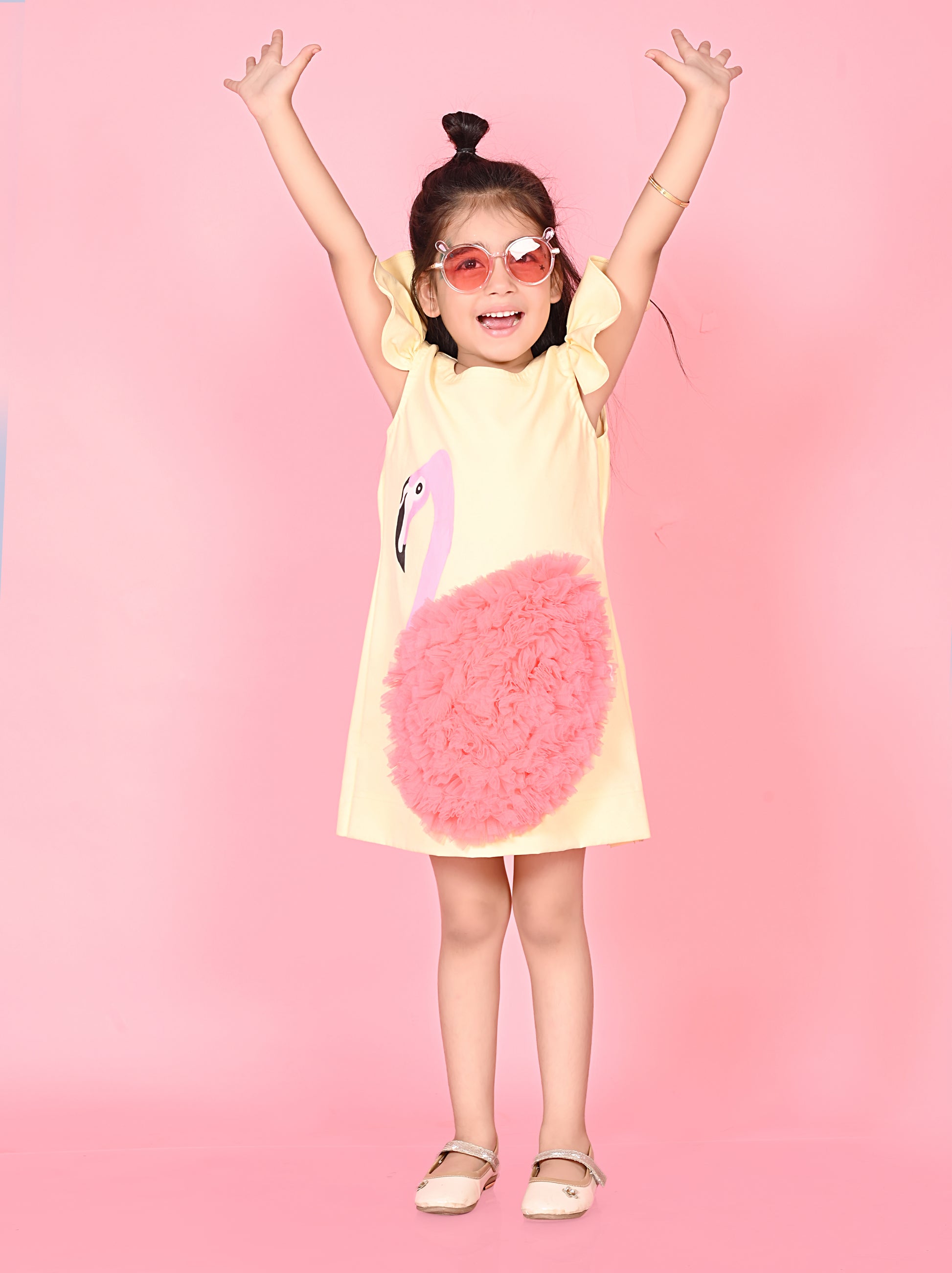 This sunny yellow T-shirt dress shines with a flamingo hand embroidery, bringing playful charm to the design. Ruffle detailing adds a fun, feminine touch, making it a vibrant and handcrafted statement piece. A perfect blend of whimsy, comfort, and artisanal craftsmanship.