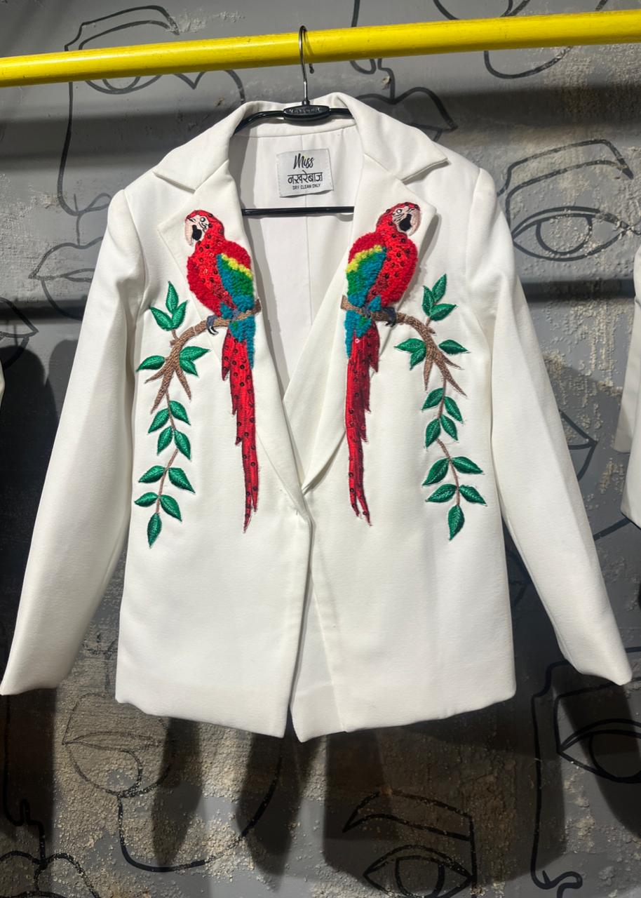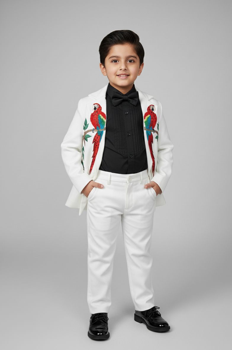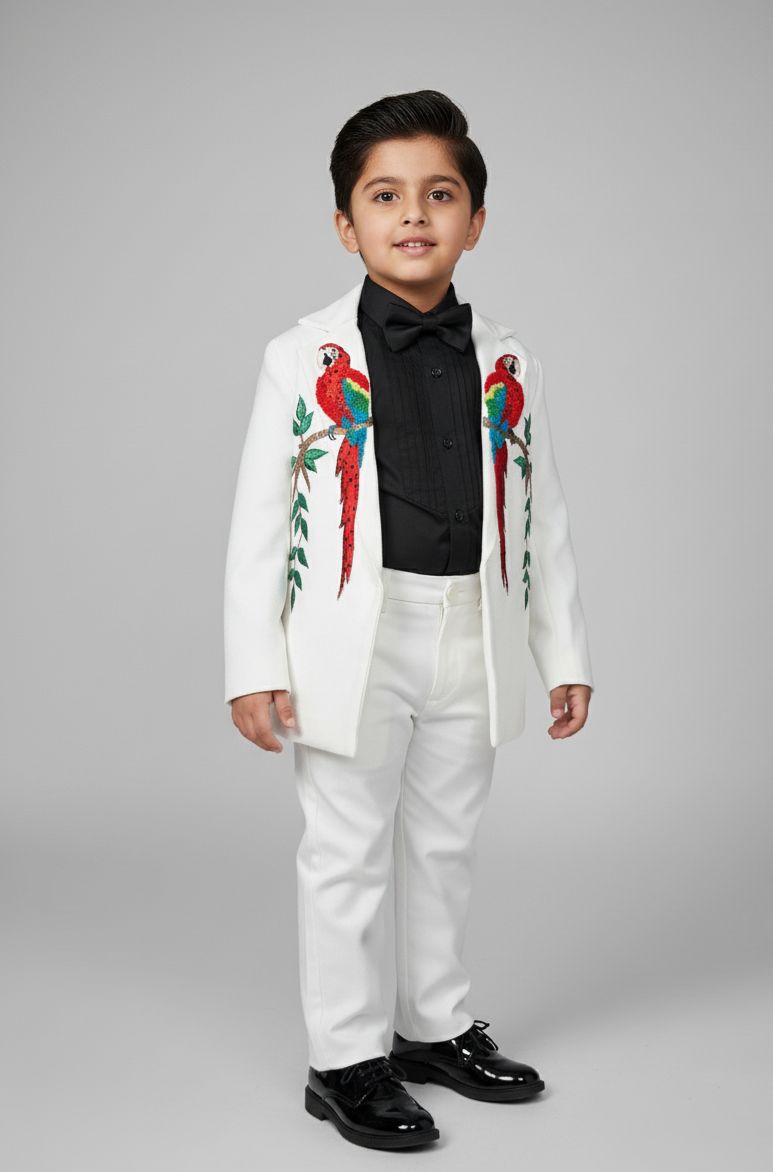 Let your little one make a statement with our Paradise Parrot Embellished Blazer Set, designed to exude elegance and charm. The pristine white blazer is artfully adorned with hand-embroidered macaw parrots, embellished with cut-dana, sequins, and fine threadwork for a vibrant and luxurious finish. Paired with a tailored formal pant, classic pin-tuck shirt, and a sleek bow tie, this set offers a complete, refined look. Perfect for weddings, receptions, birthdays, and special celebrations. A sophisticated blend of craftsmanship and playful elegance, ensuring every moment becomes picture-perfect.