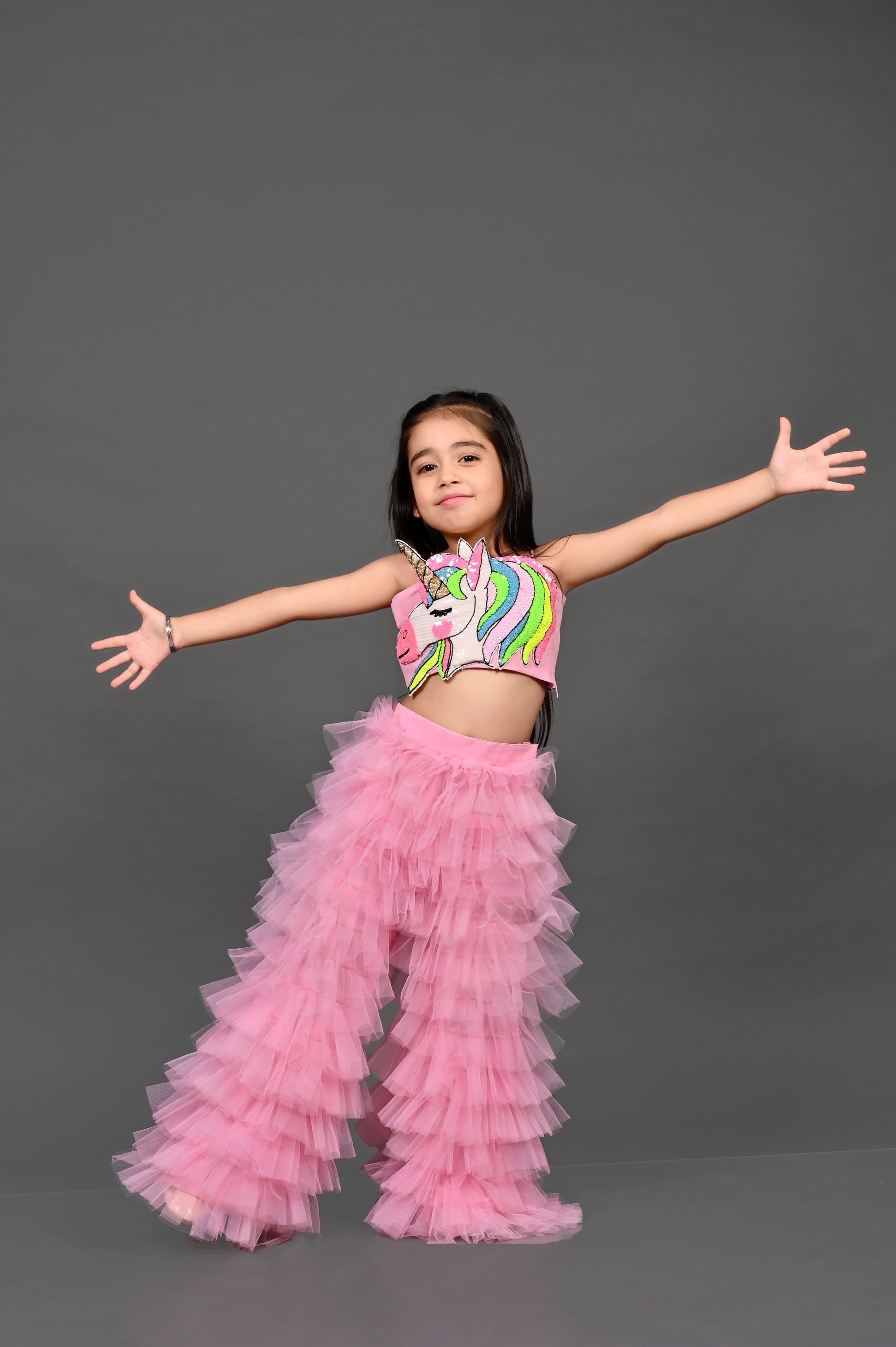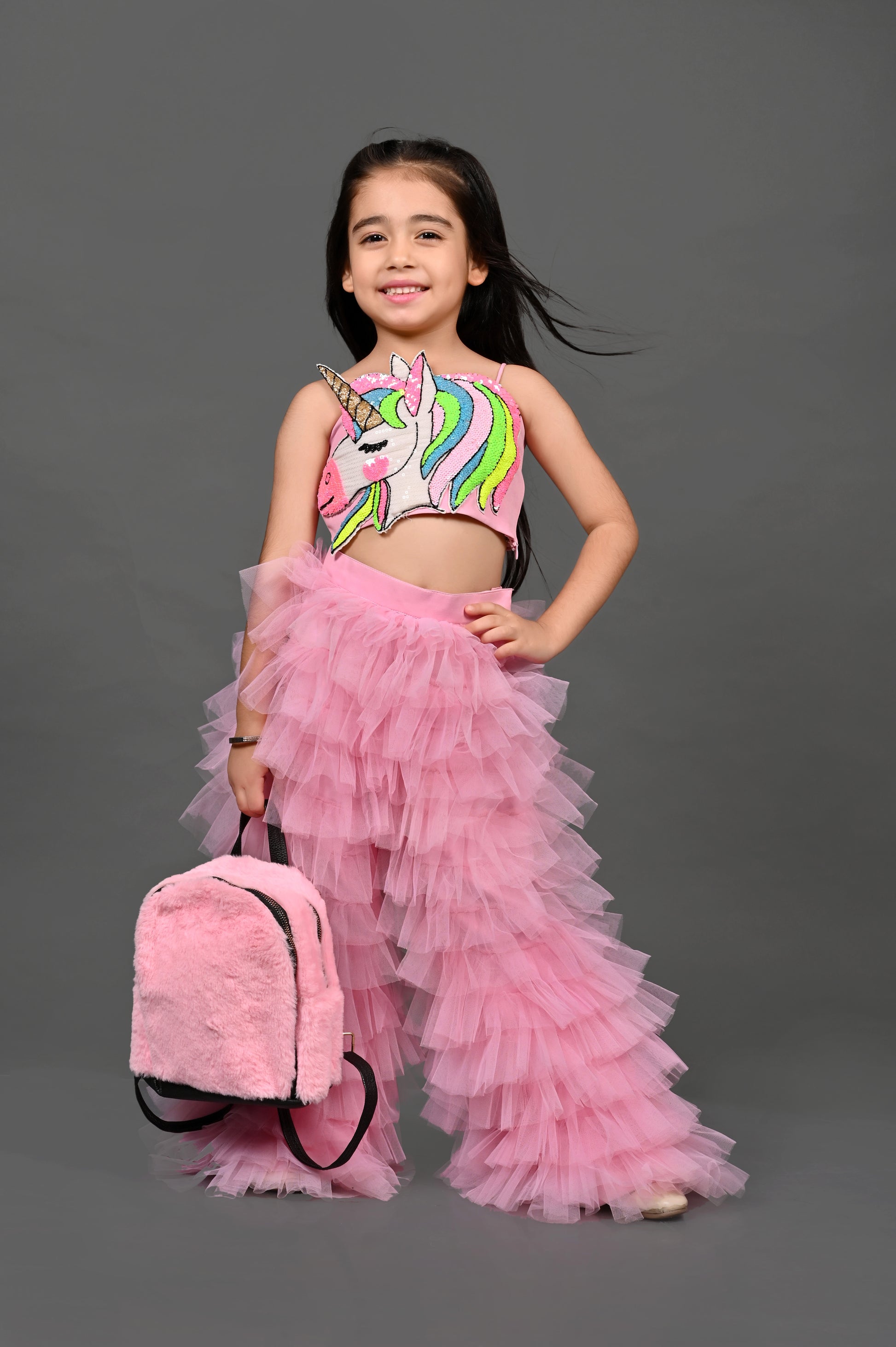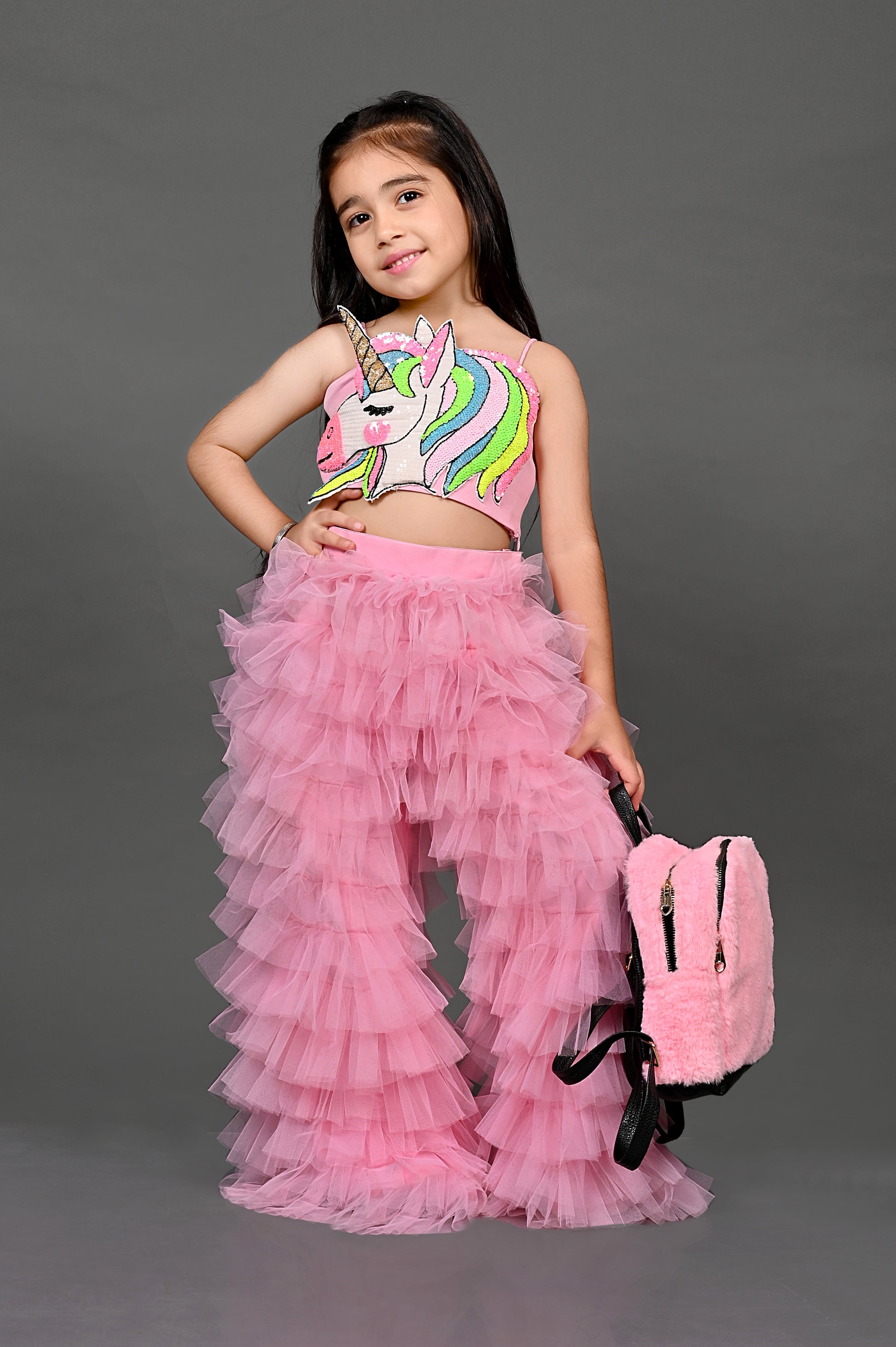This pink ensemble captures a dreamy charm with its Unicorn motif, intricately hand-embroidered to perfection. The Japanese fabric top is further embellished with delicate sequin work, adding a subtle sparkle that enhances its whimsical appeal. Ruffle detailing along the edges brings playful movement, while the paired twill pants balance the look with a smart and stylish touch.